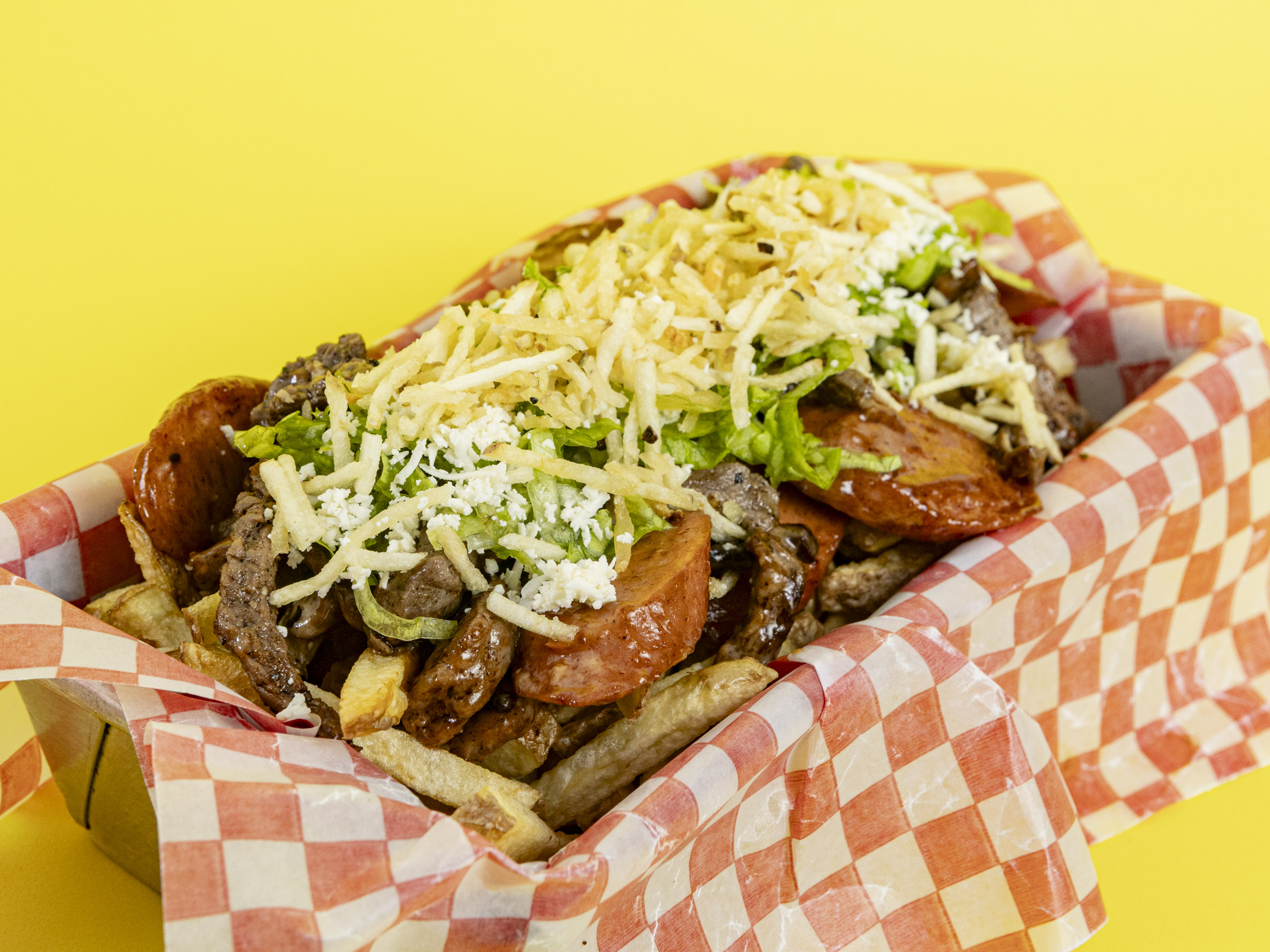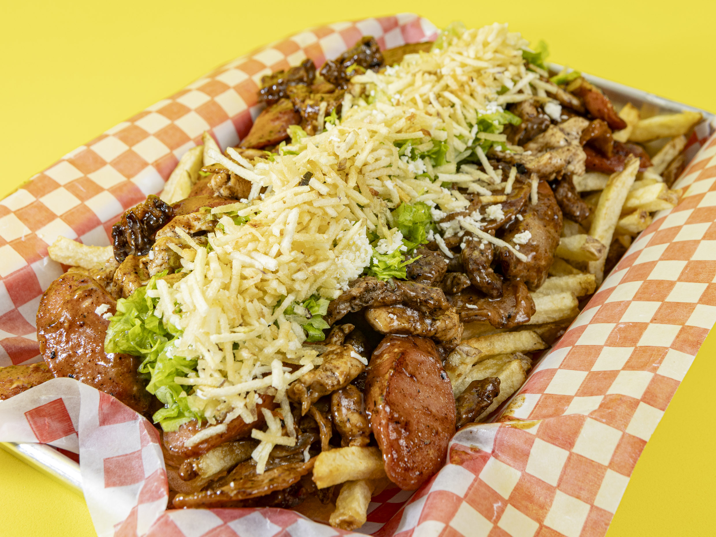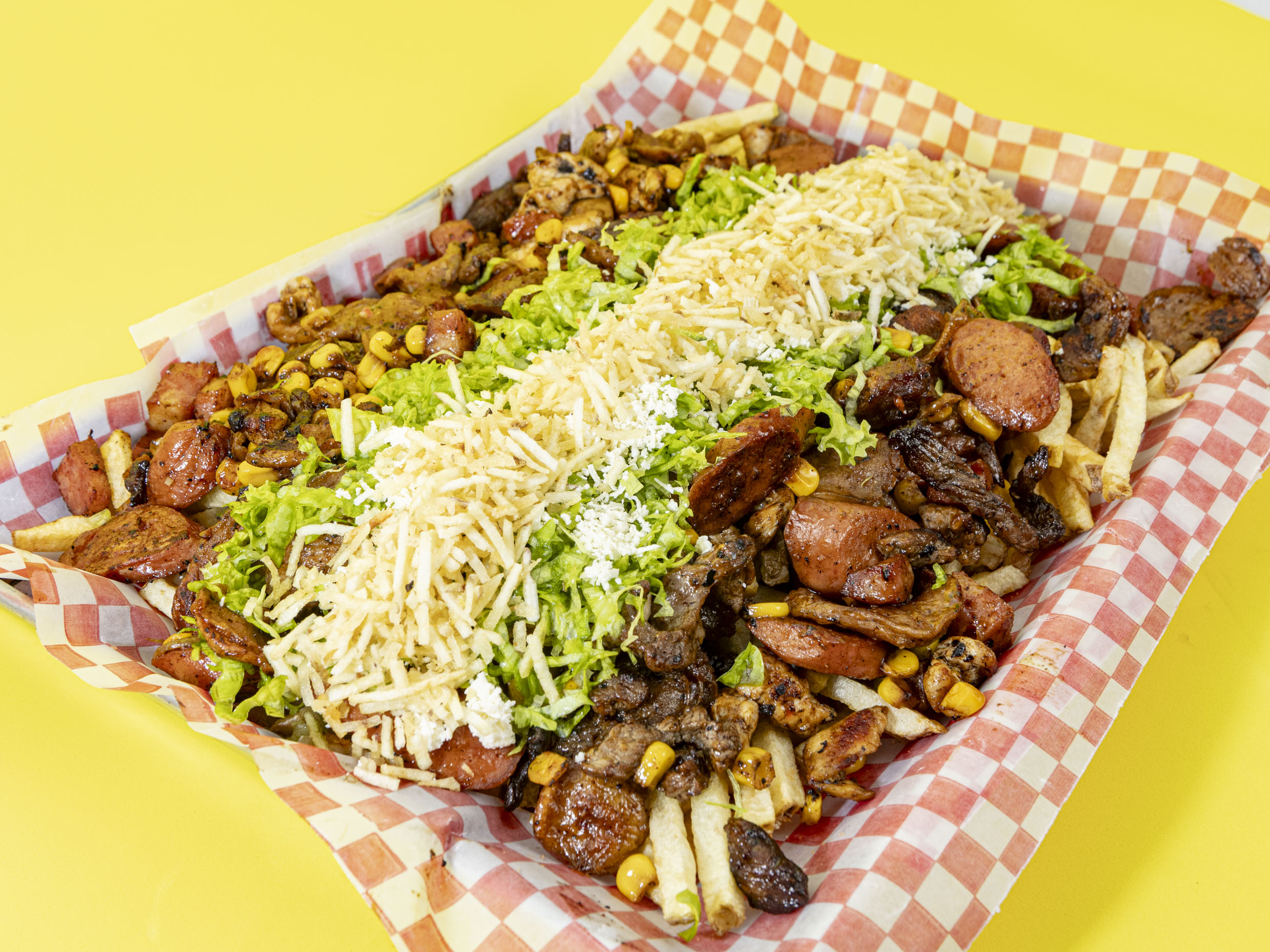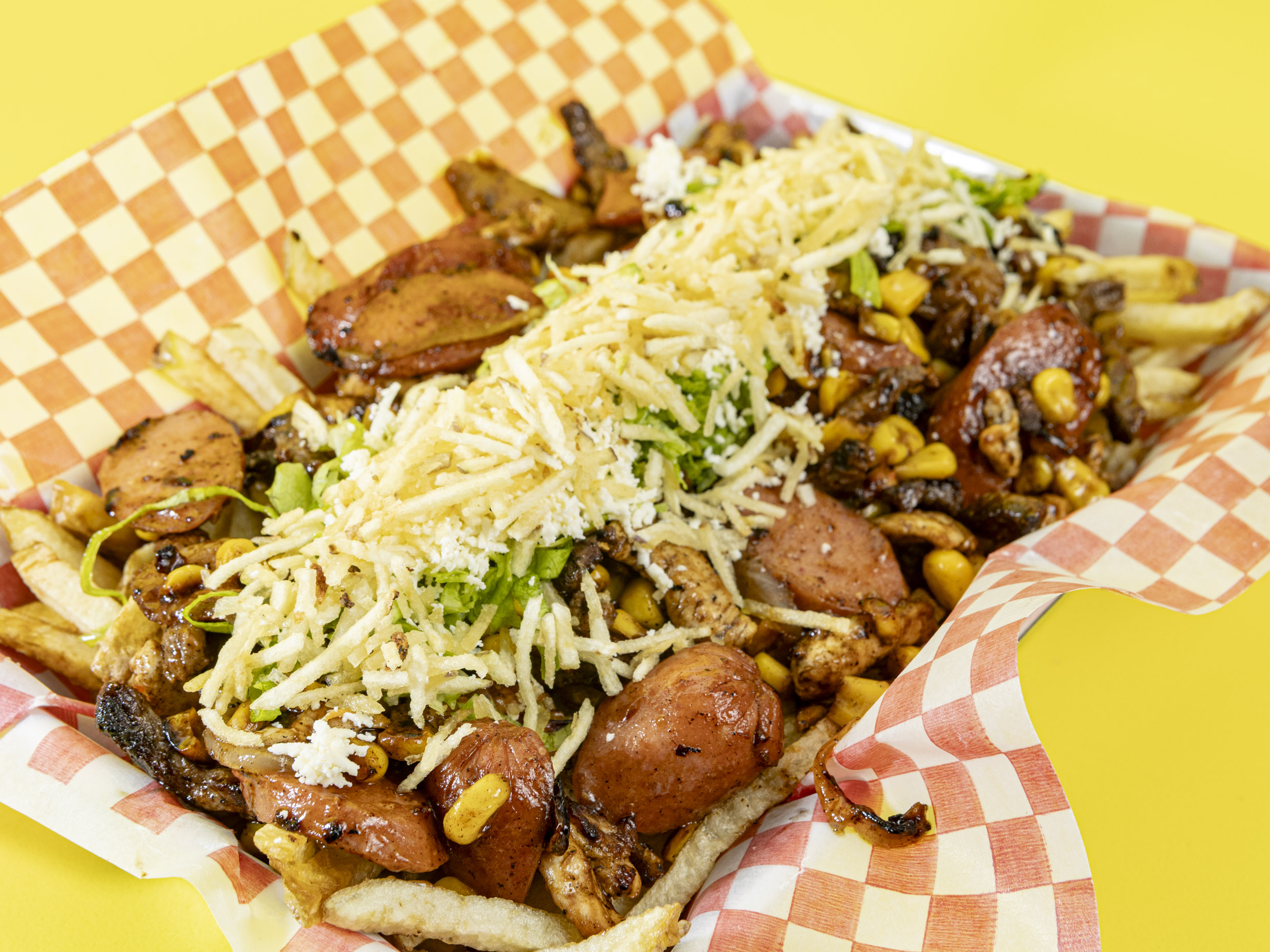 Papa francesa artesanal, salchicha, carne, pollo, butifarra, maíz, queso costeño, cabello de ángel.
