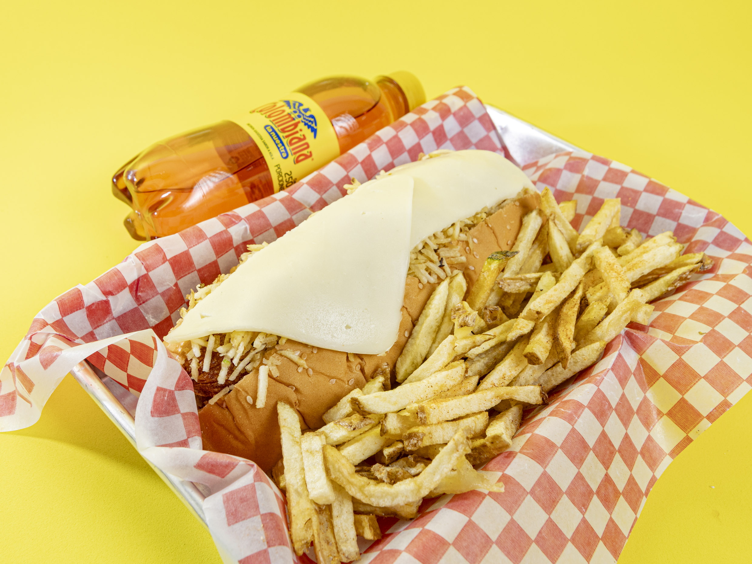 Papa francesa artesanal, salchicha, butifarra, 1 acompañante, queso costeño, cabello de ángel.