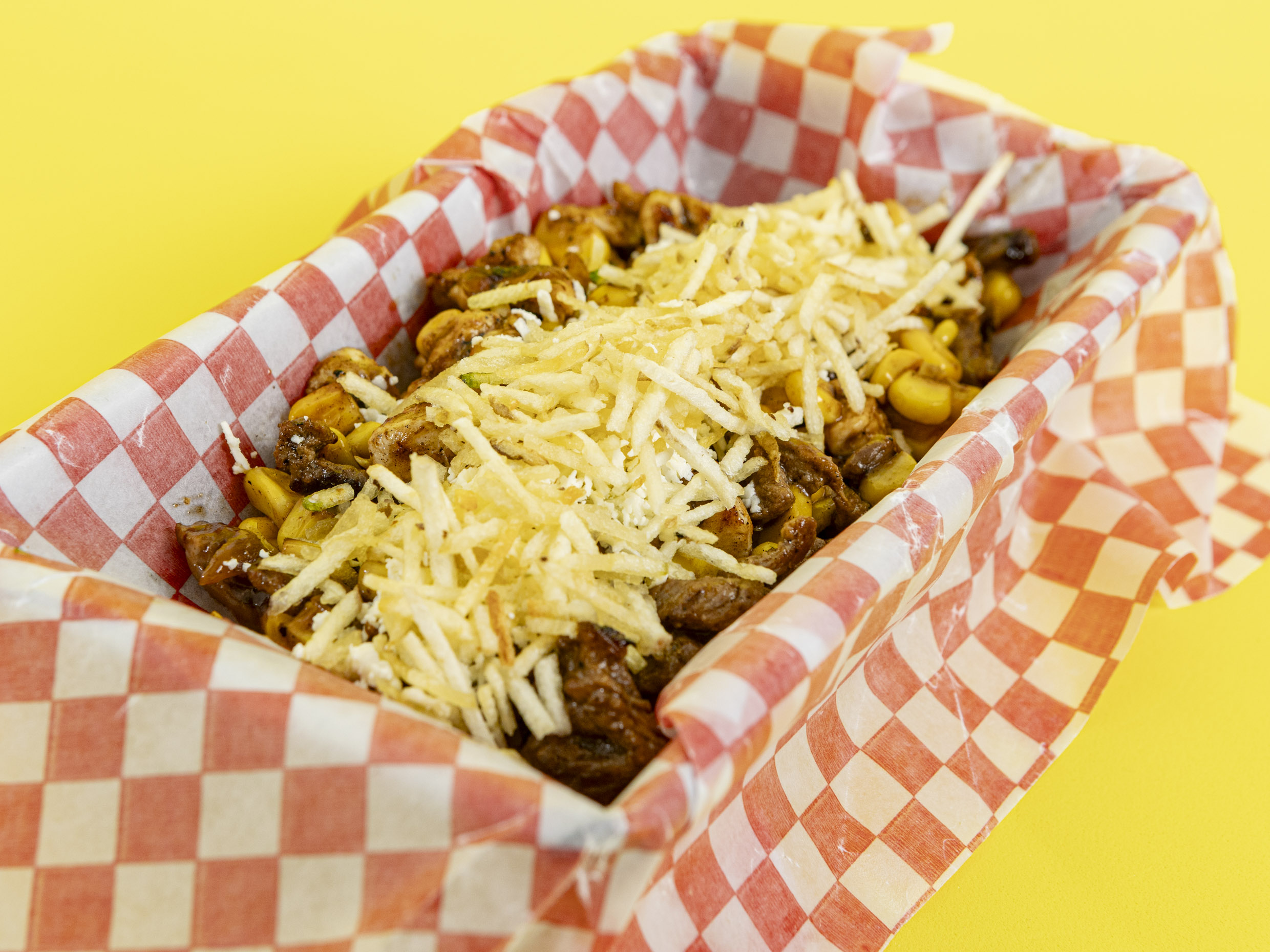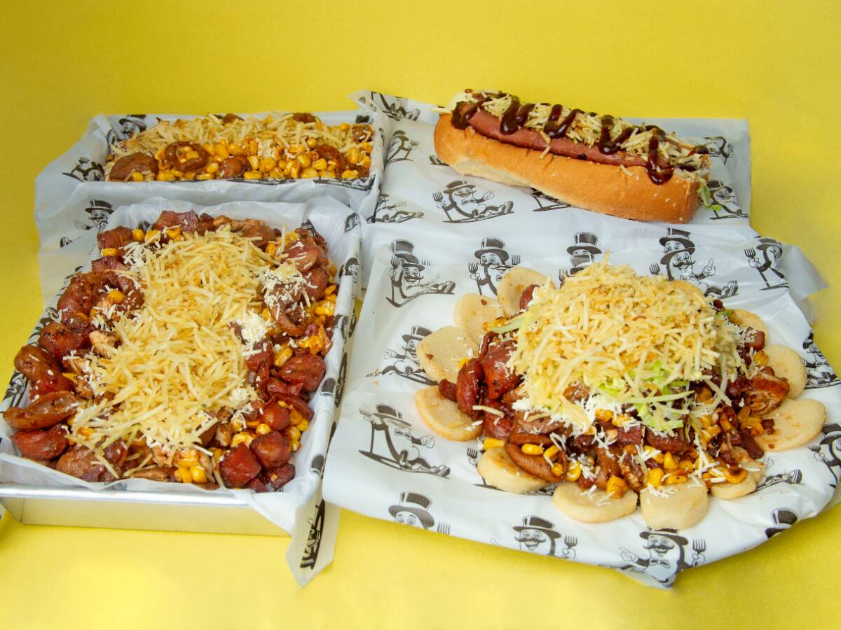 Papa francesa artesanal, salchicha, butifarra, carne, pollo, costilla, tocineta, maíz, queso costeño, cabello de ángel.