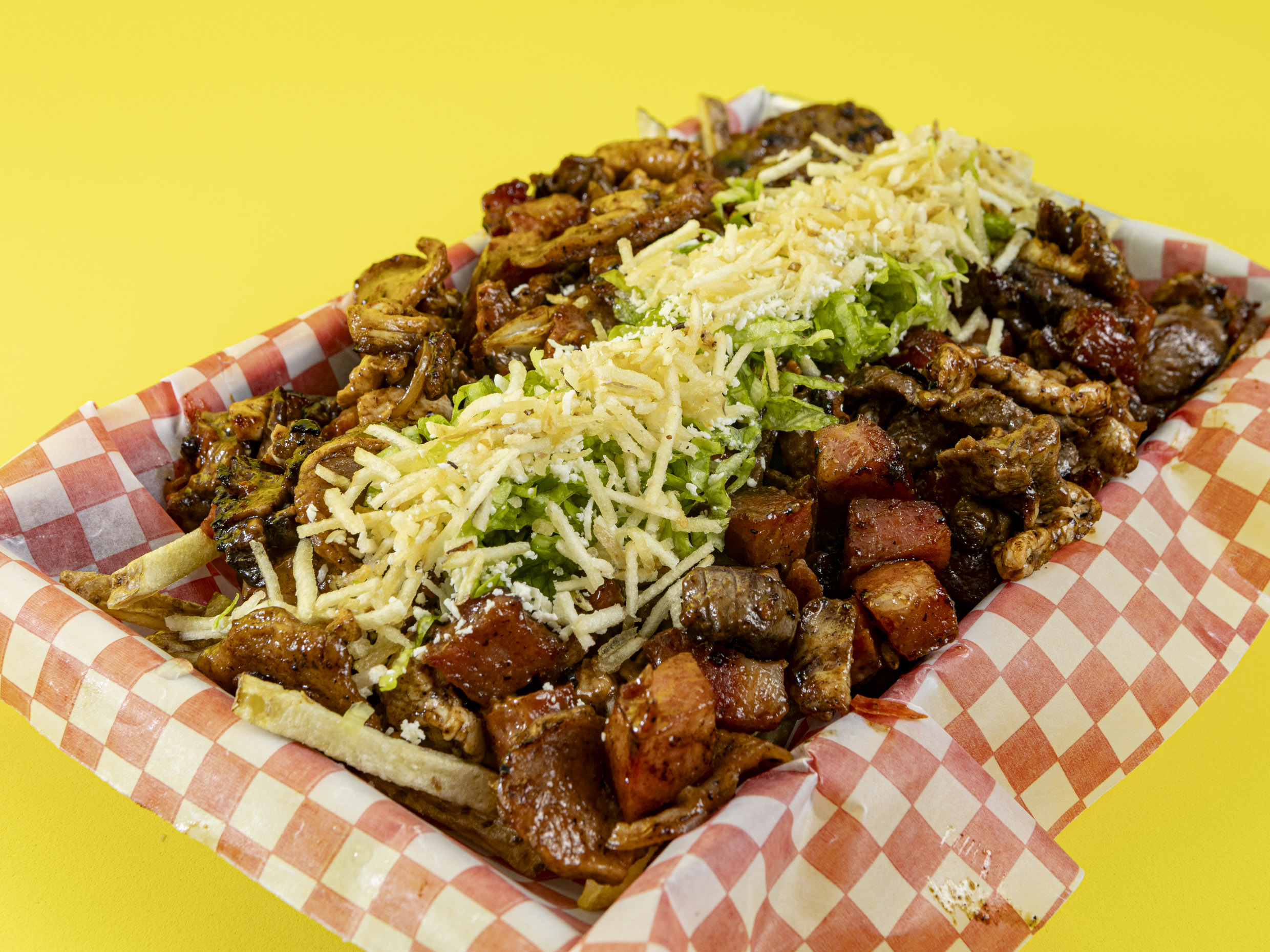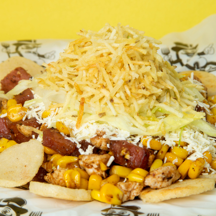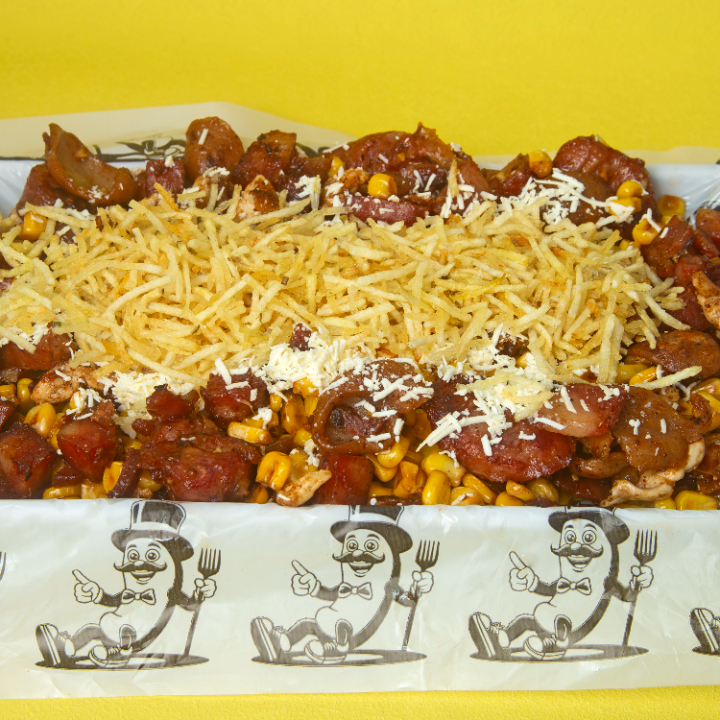 Papa francesa artesanal, costilla, chorizo, butifarra, queso costeño, cabello de ángel.