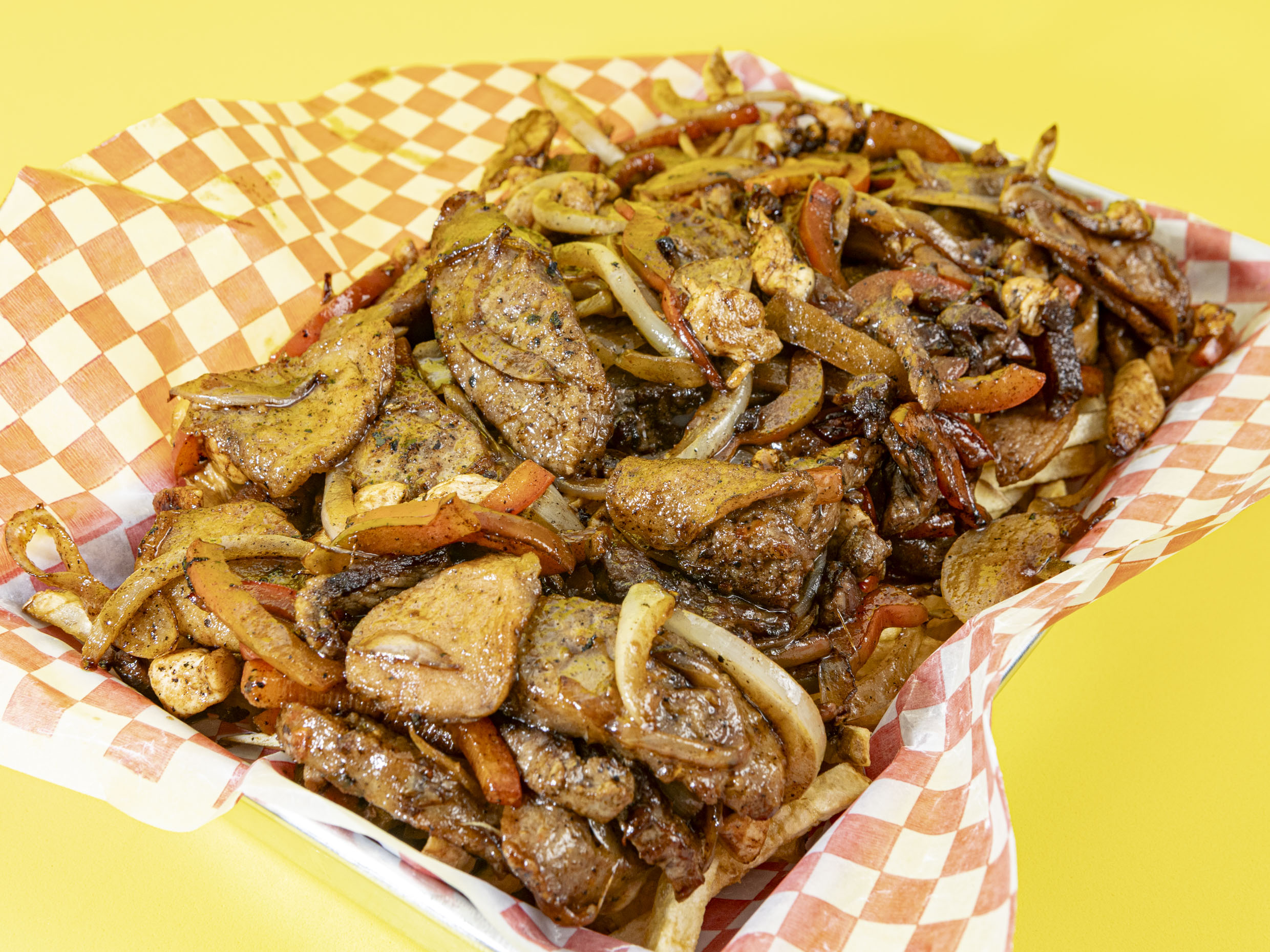 Papa francesa artesanal, carne y pollo, pimentón, cebolla, butifarra,chorizo.