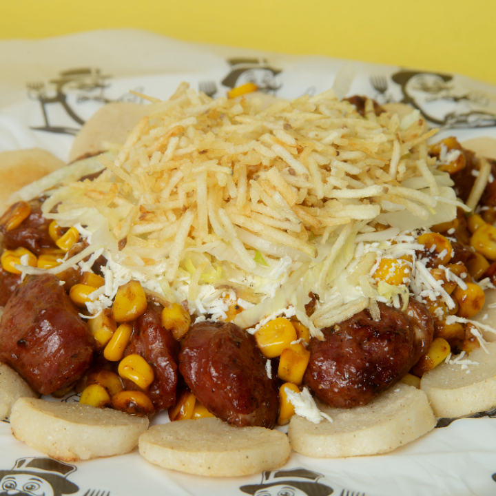 Maíz, butifarra, carne/pollo, lechuga, queso costeño, cabello de ángel, salsa de la casa, costilla, tocineta, salchicha.