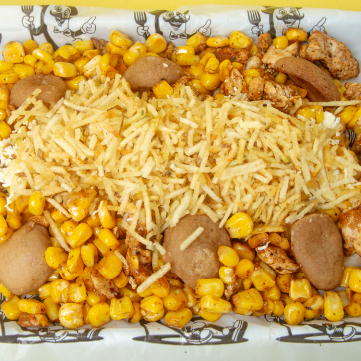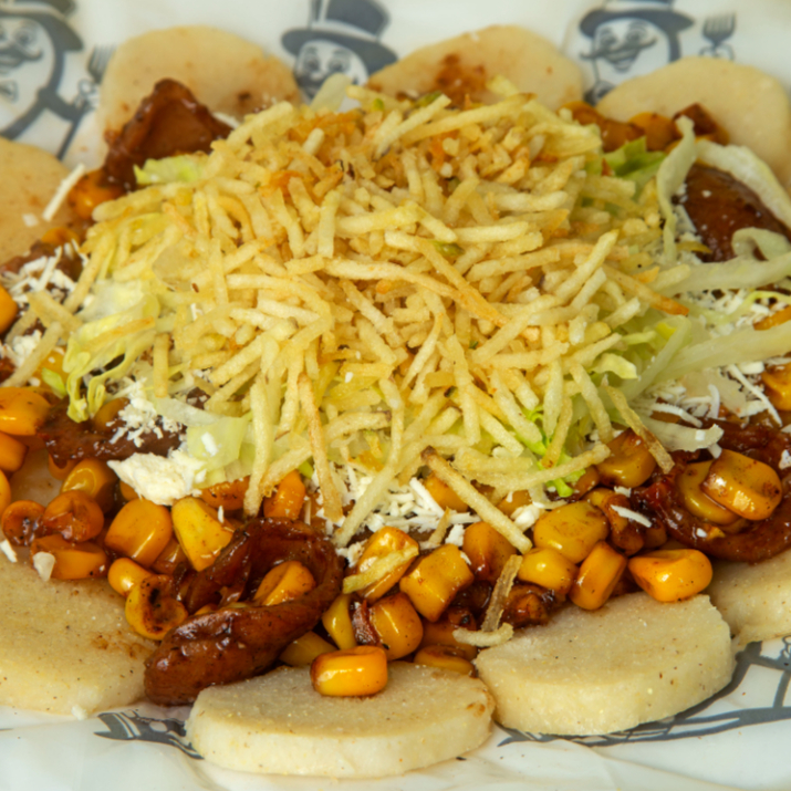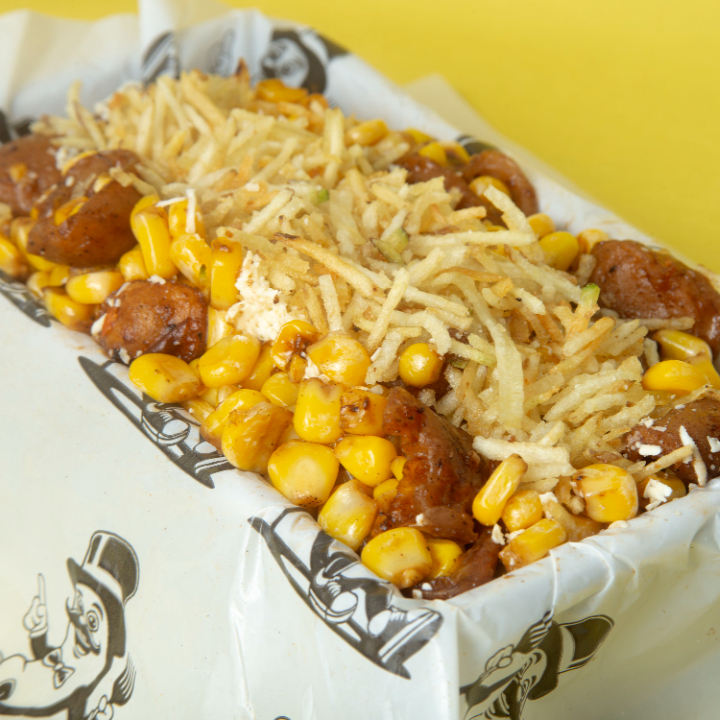 200g De maíz, queso costeño, dos proteinas a elección, salsa como mayonesa, tartara, bufalo y cabello de angel.
