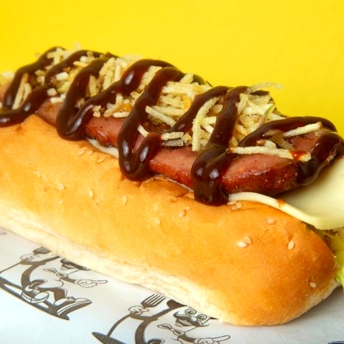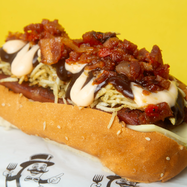 Papa francesa artesanal, salchicha, butifarra, queso costeño, lechuga, cabello de ángel, salsa de la casa