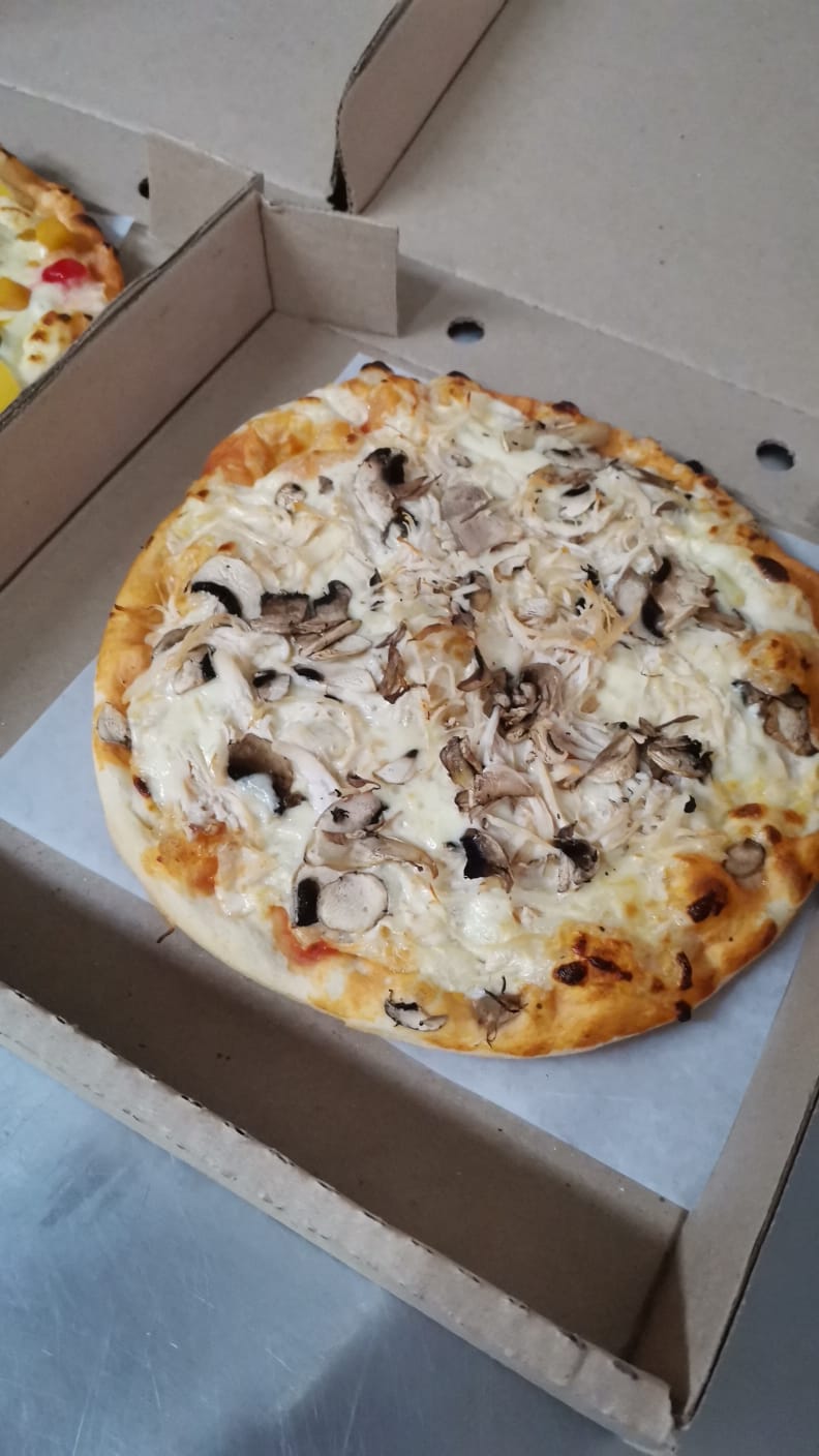 Pollo, champiñones, salsa de la casa y queso.