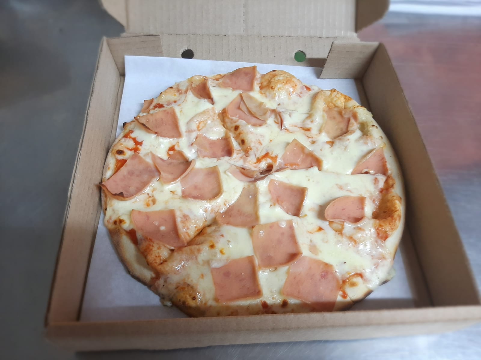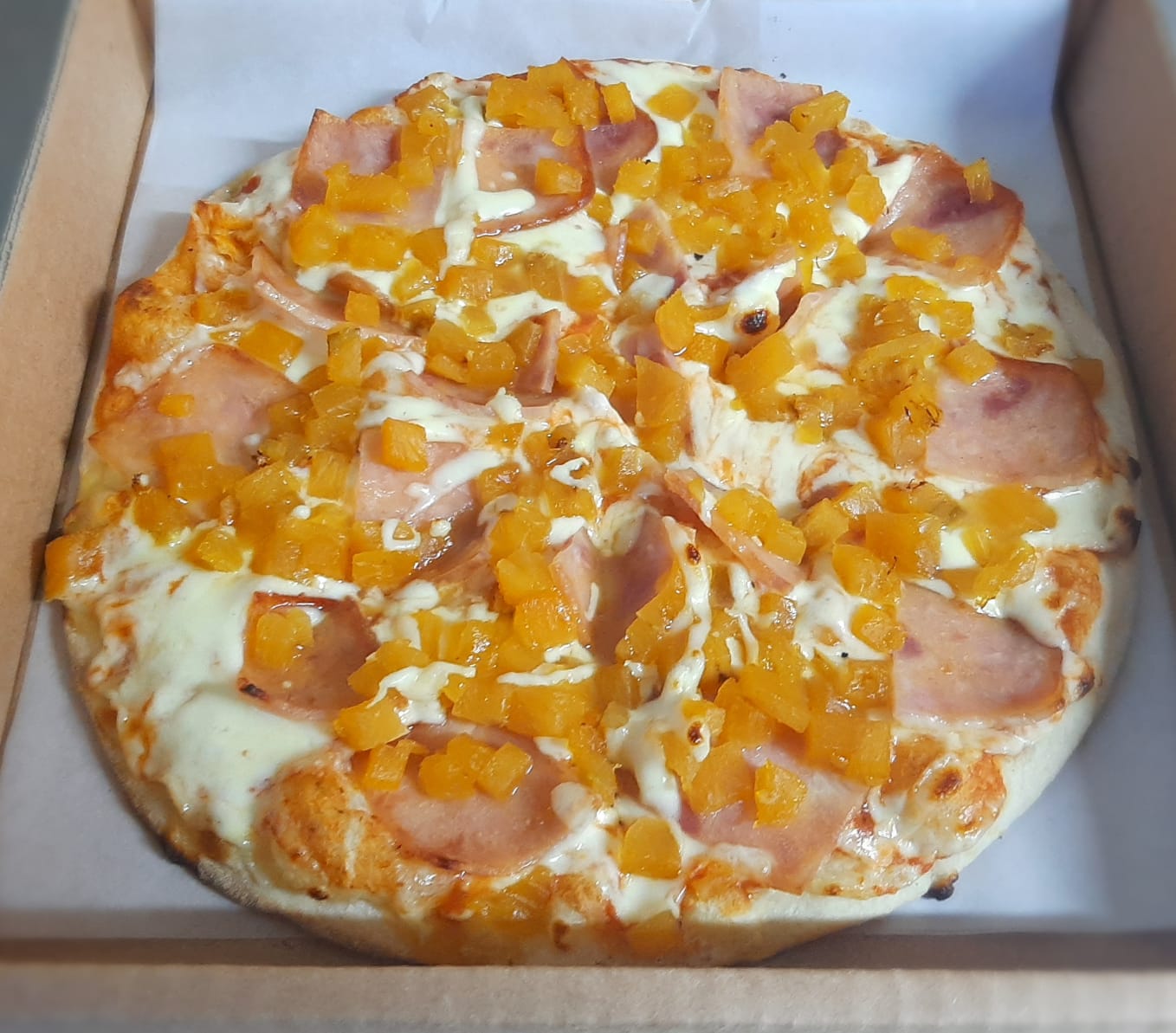 Piña, jamón, salsa de la casa y queso.