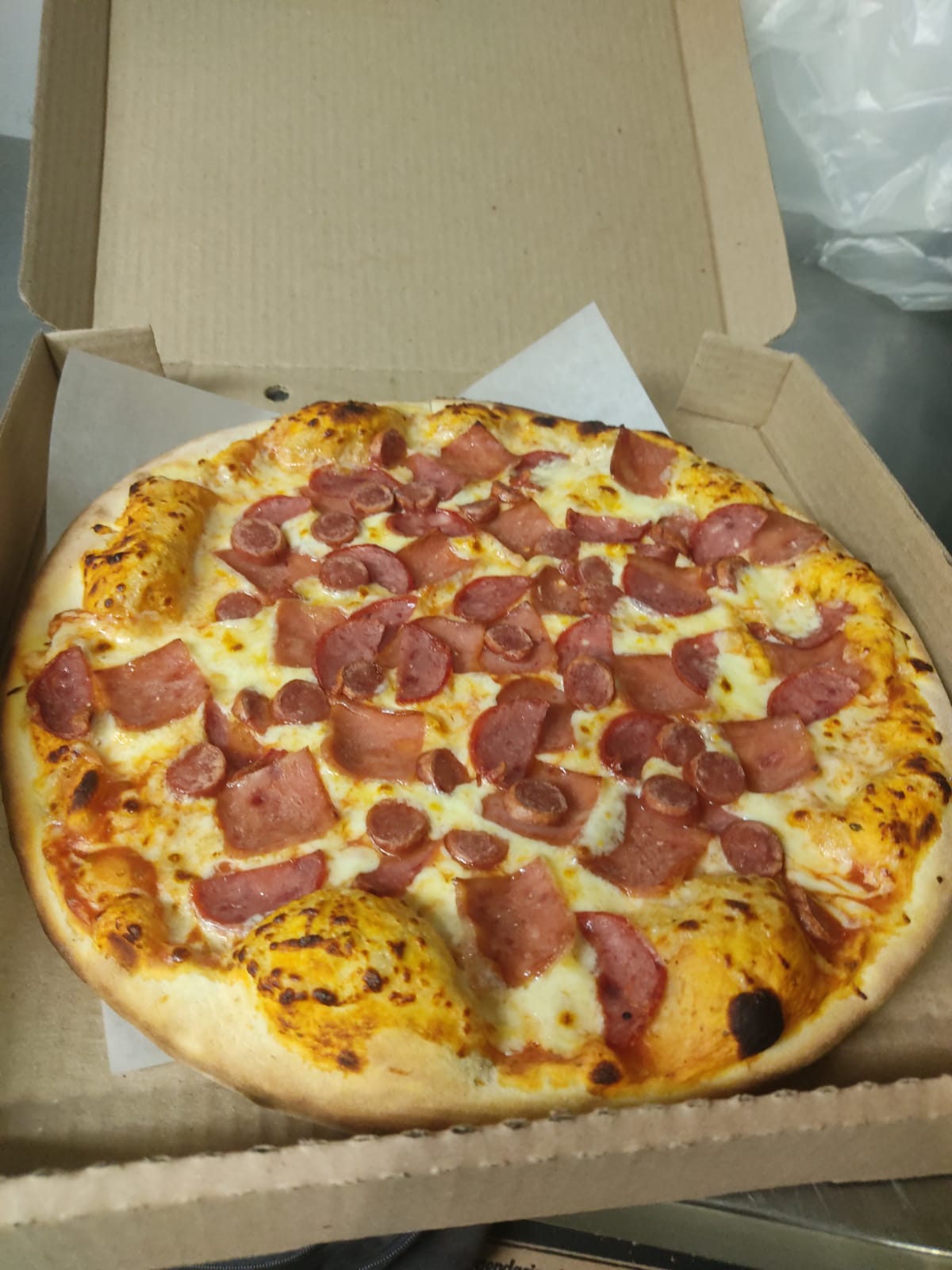 Salami, cabano, jamón, salsa de la casa y queso.