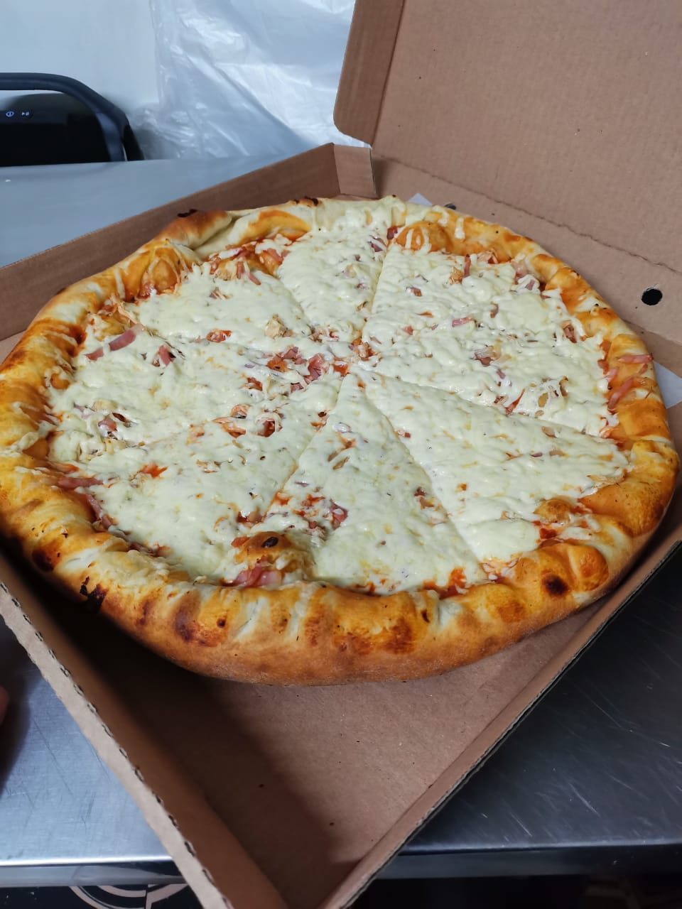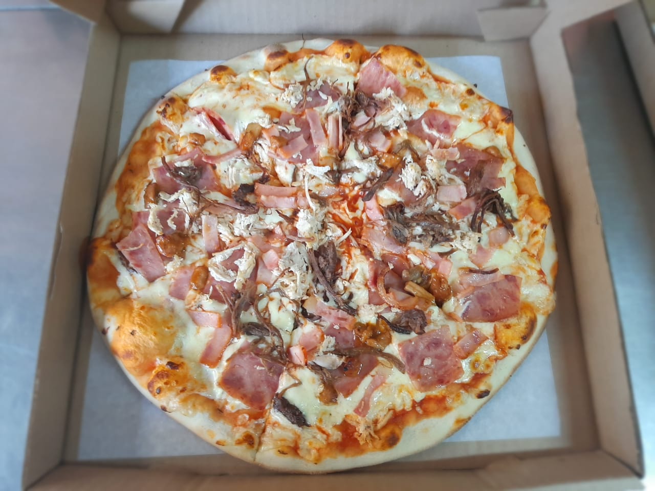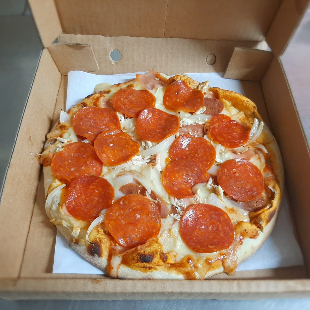 Pepperoni, pollo, jamón, cebolla, cabano y queso.
