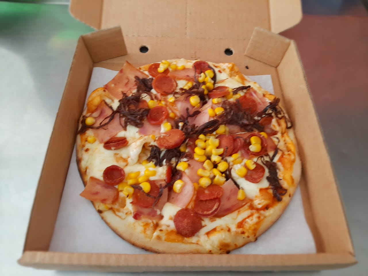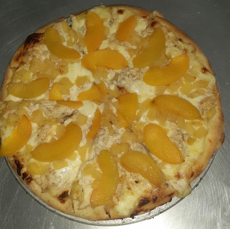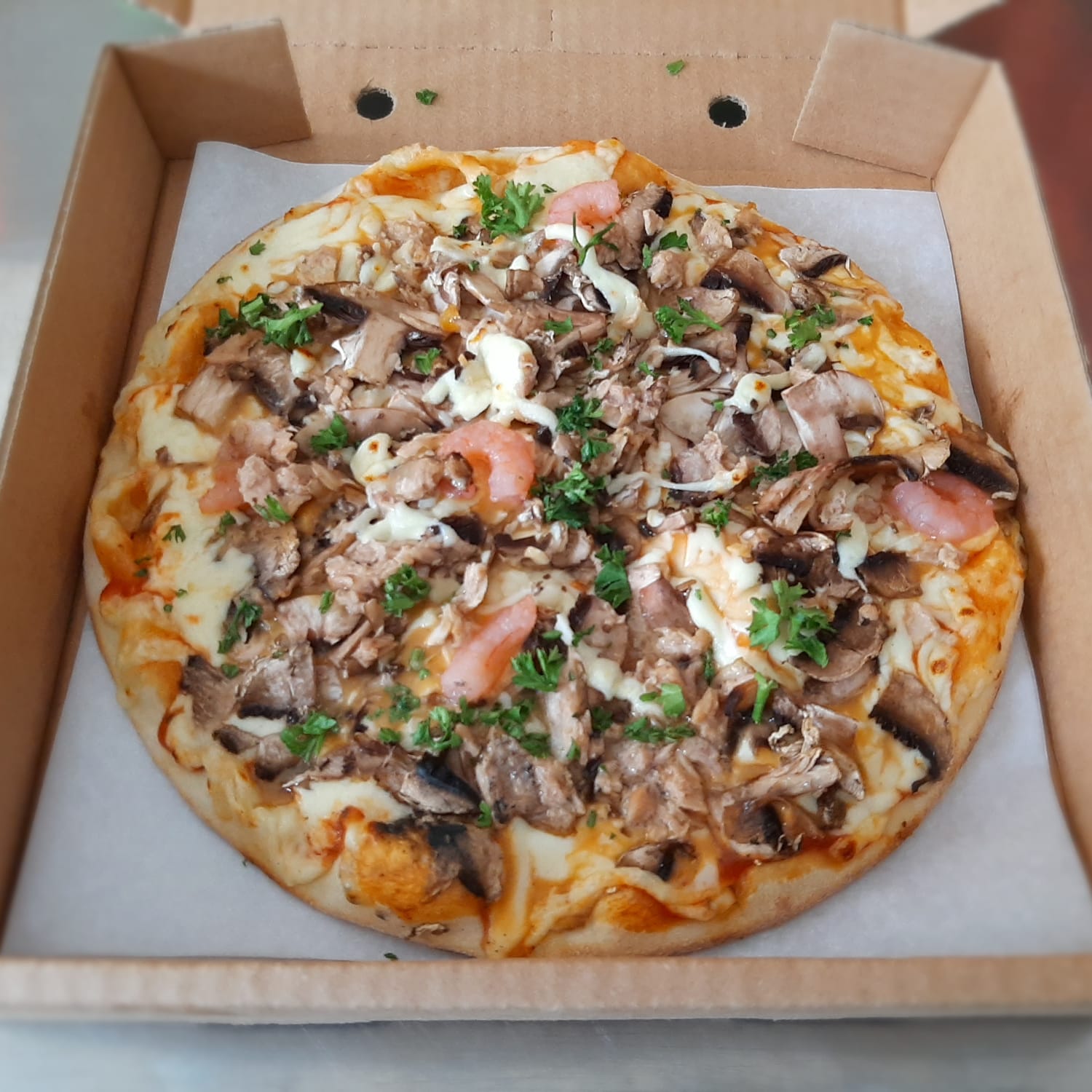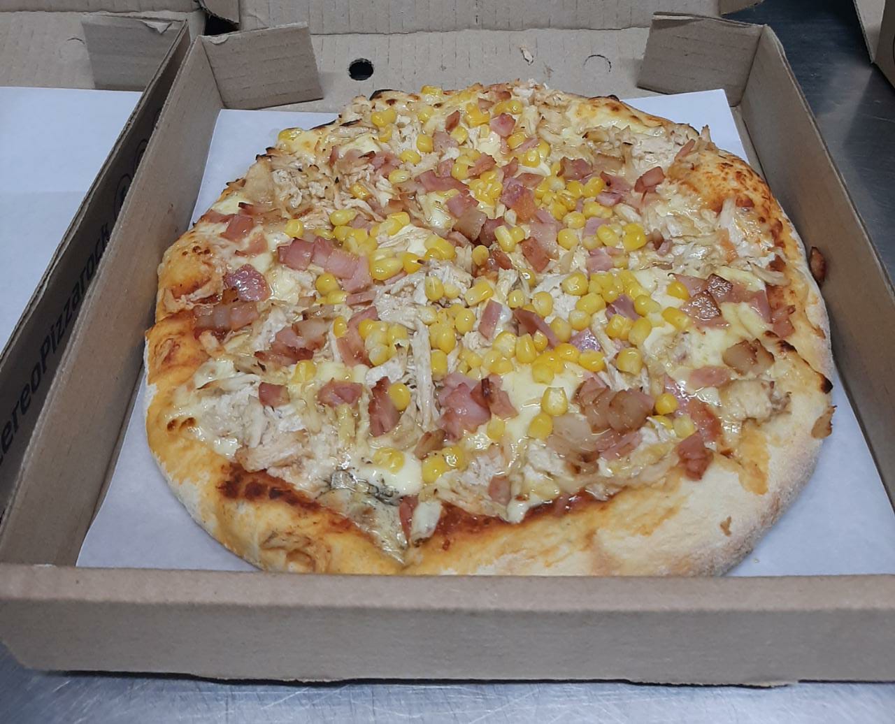Pepperoni, pollo, jamón, cebolla, cabano y queso.