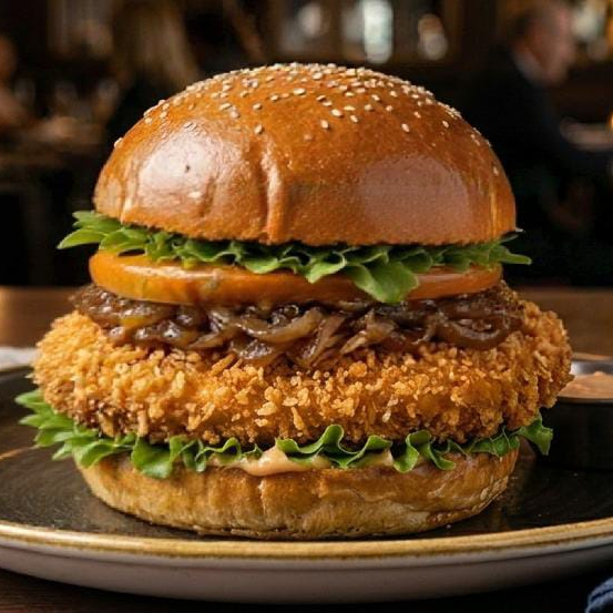Hamburguesa en pan brioche con pollo apanado, queso tajado, lechuga fresca, tomate y cebolla cabezona.