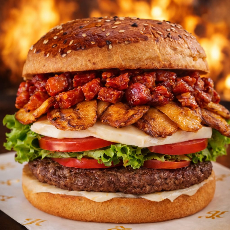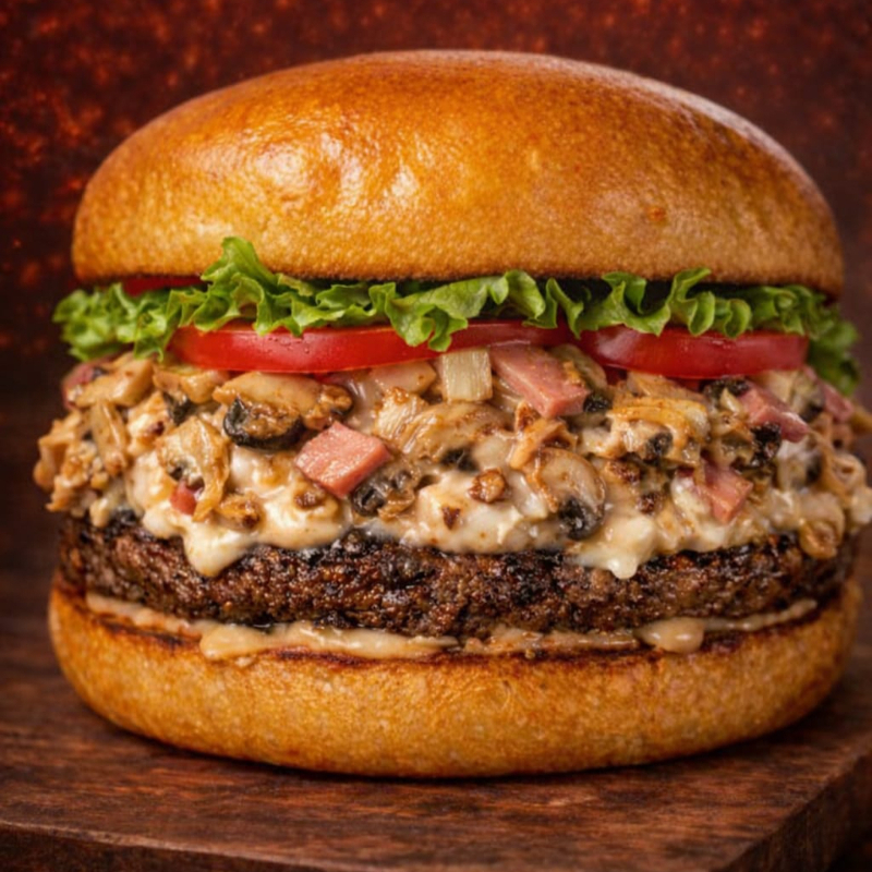 Hamburguesa en pan brioche con carne de res, queso tajado, jamón, mezcla de pollo con champiñones, lechuga fresca, tomate y cebolla cabezona