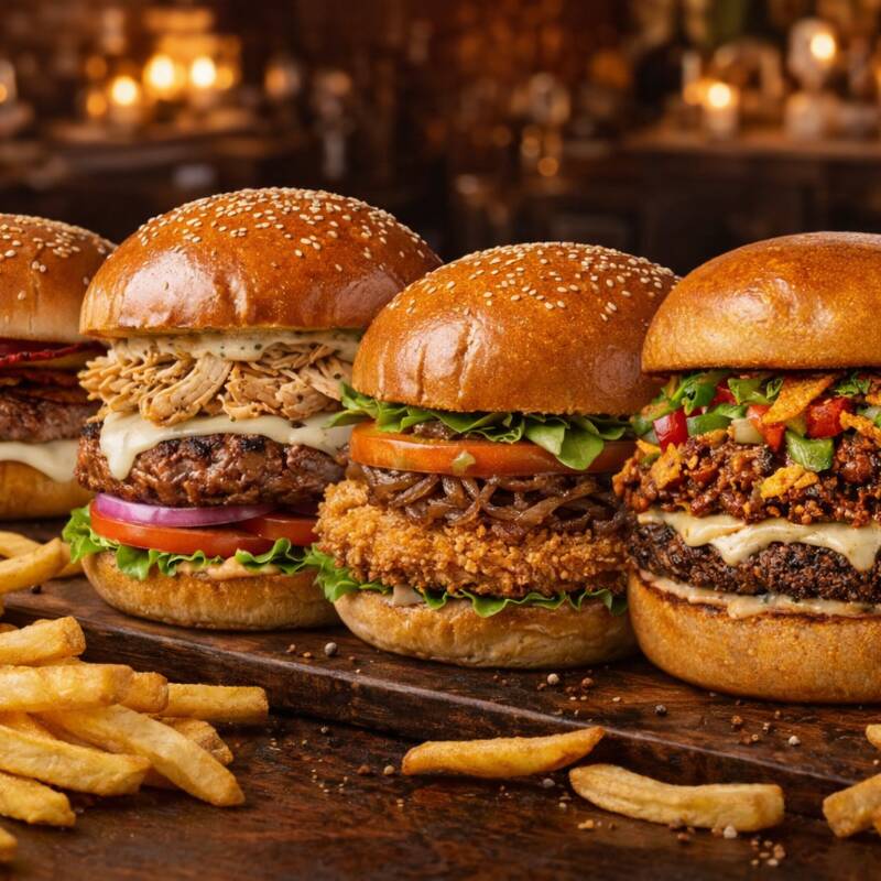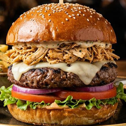 Hamburguesa en pan brioche con carne de res, pollo desmechado, queso tajado, lechuga fresca, tomate y cebolla cabezona.