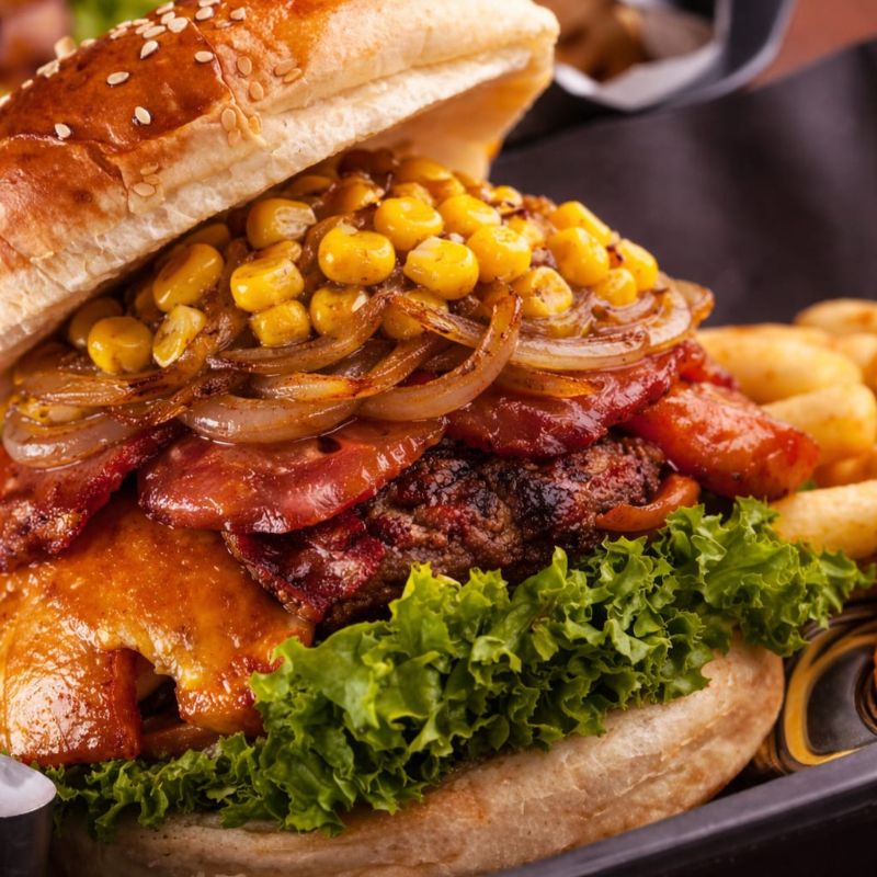 Hamburguesa en pan brioche con carne de res, queso tajado, maíz tierno, plátano maduro, lechuga fresca, tomate y cebolla cabezona.