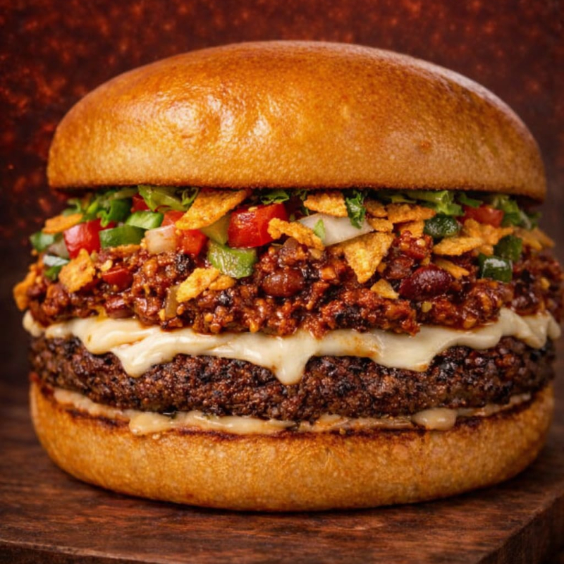 Hamburguesa en pan brioche con carne de res, queso tajado, chili con carne, tostacos, lechuga fresca, tomate y cebolla cabezona.