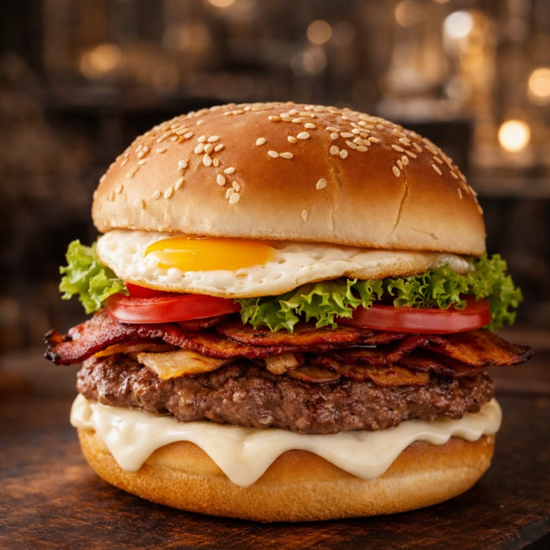 Hamburguesa en pan brioche con carne de res, queso tajado, huevo criollo, tocineta, lechuga fresca, tomate y cebolla cabezona.
