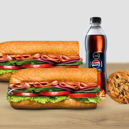 Disfruta este combo con 2 Subs 15 cms +1 Bebida + 1 Galleta a un gran precio. Elige tus Subs 15cm entre Pavo, Jamón o Pavo & Jamón.