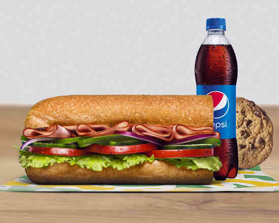 Tu footlong de jamón favorito, de 30 centimetros en combo, y armándolo con una bebida, papas o galleta para acompañarlo