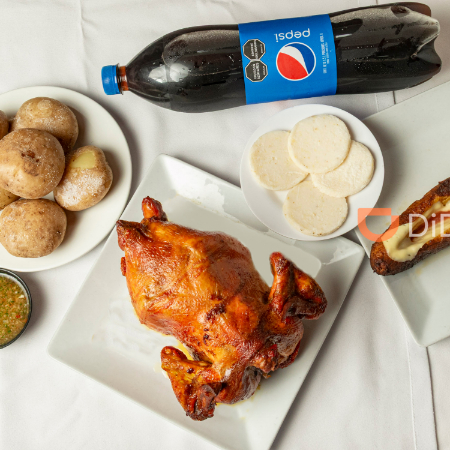 12 Presas de pollo con 9 papas saladas, 1 plátano de queso, bocadillo, salsas de la casa, ají, 8 arepas y bebida a elegir, 1.5 l.