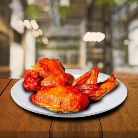 10 Alitas BBQ, papa a la francesa y vegetales.