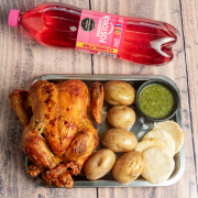 1 Pollo asado, papas saladas, arepa, 2 sopas del día, 2 porciones de arroz, 1 gaseosa Postobón 1 L (sabor sujeto a disponibilidad de la tienda).