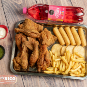 Arroz paisa, papas en casco, 10 piezas de alitas apanadas, arepa frita y 2 gaseosas 250 ml Postobón.