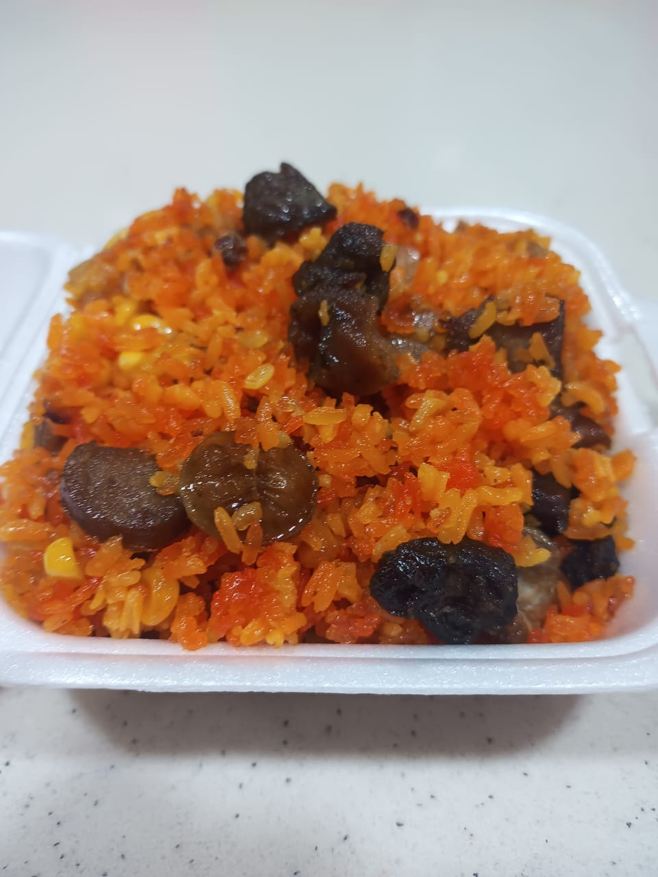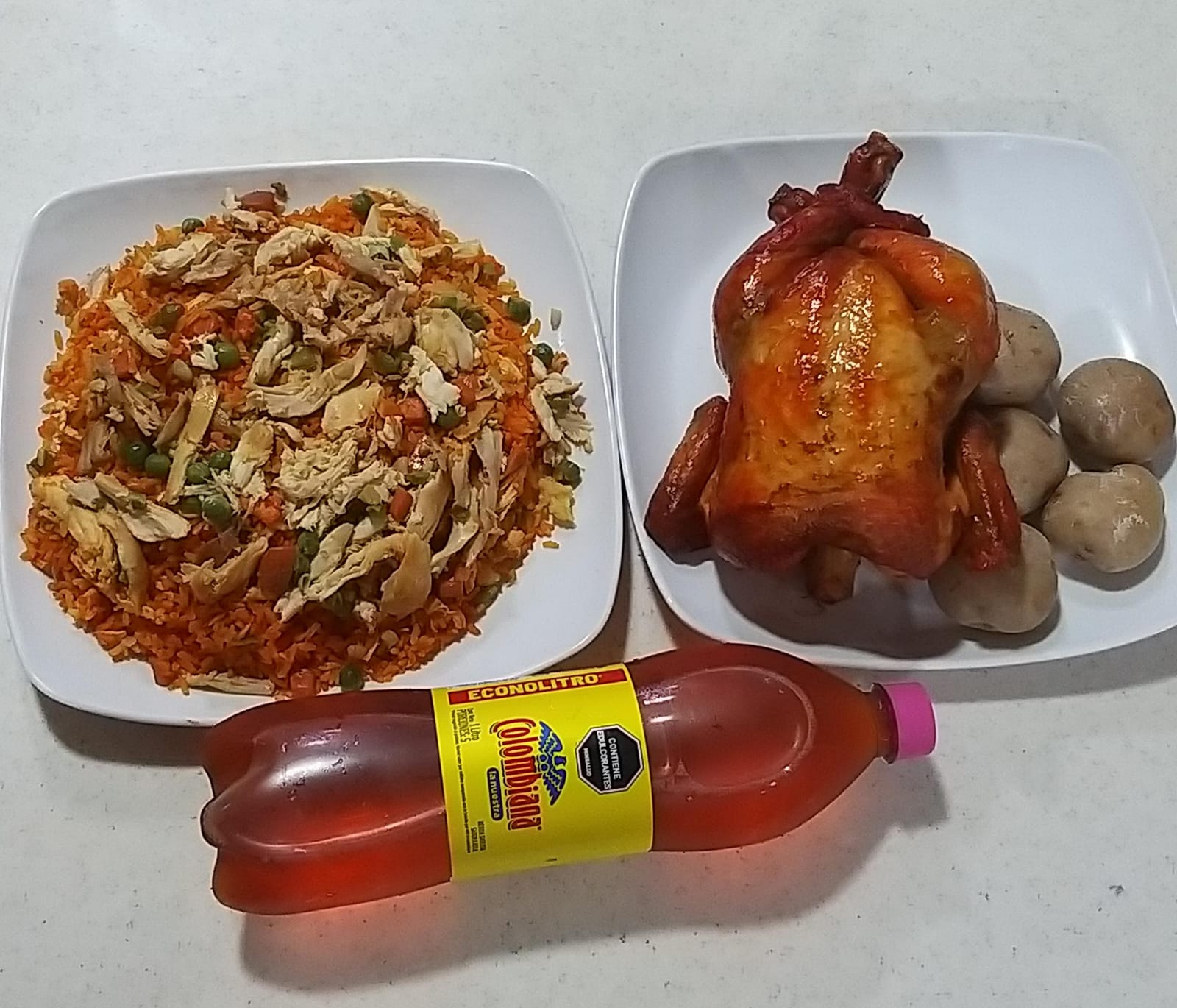 Arroz Paisa en Caja P1 + 1 Pollo Asado (8 presas), papa salada y arepa + Gaseosa 1 L Postobón (sabor sujeto a disponibilidad de la tienda)