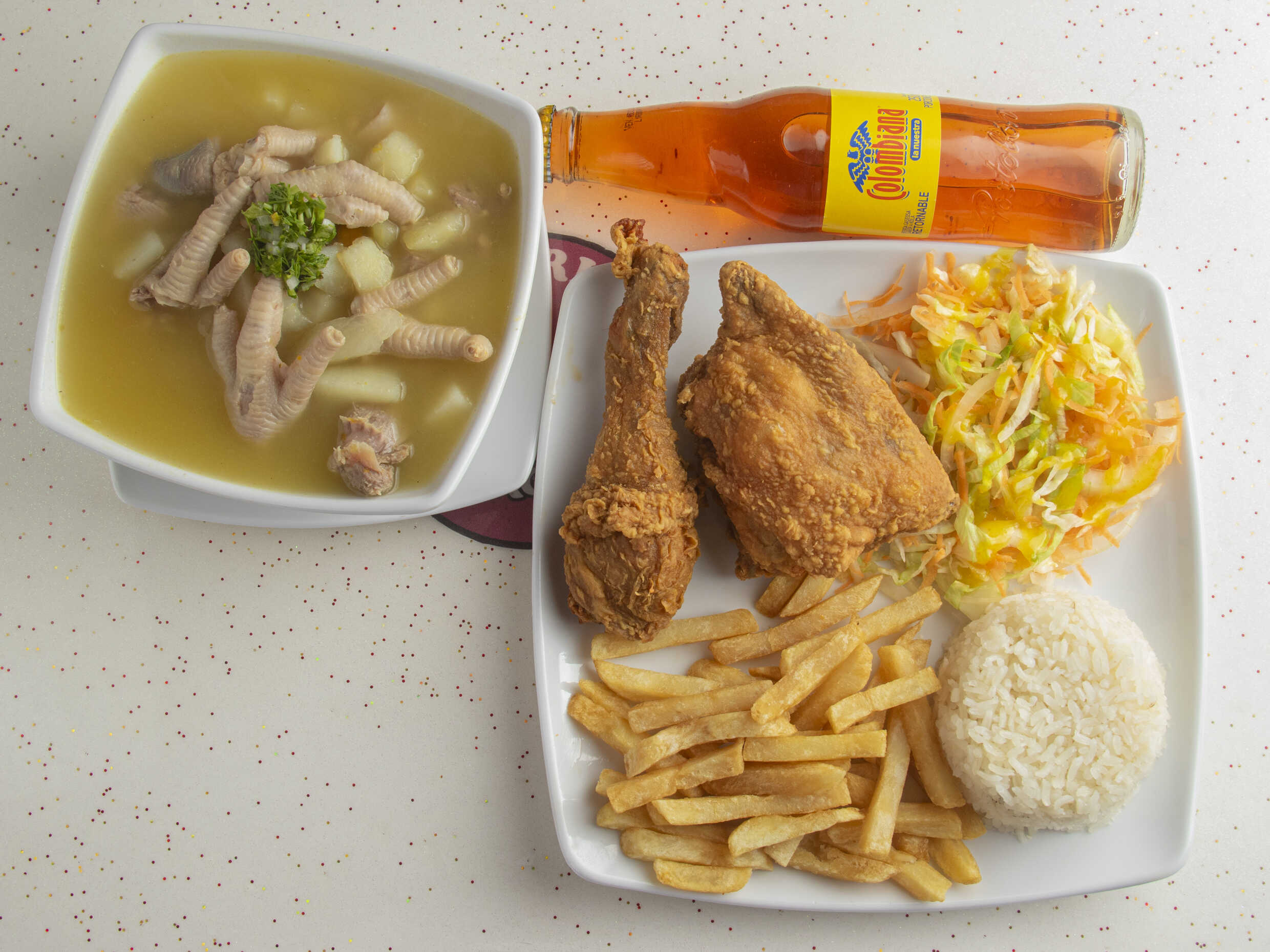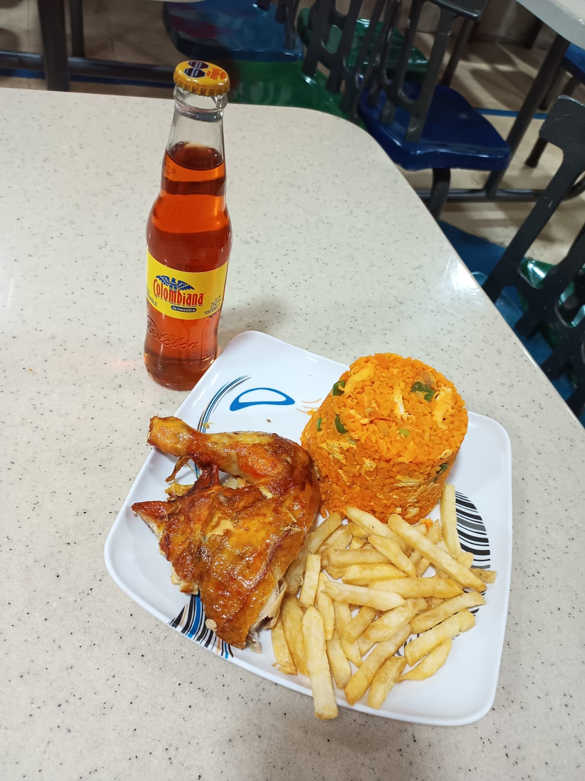 1/4 de pollo, papa francesa, arroz, ensalada, gaseosa mini postobón (sabor sujeto a disponibilidad de la tienda) y sopa del día.