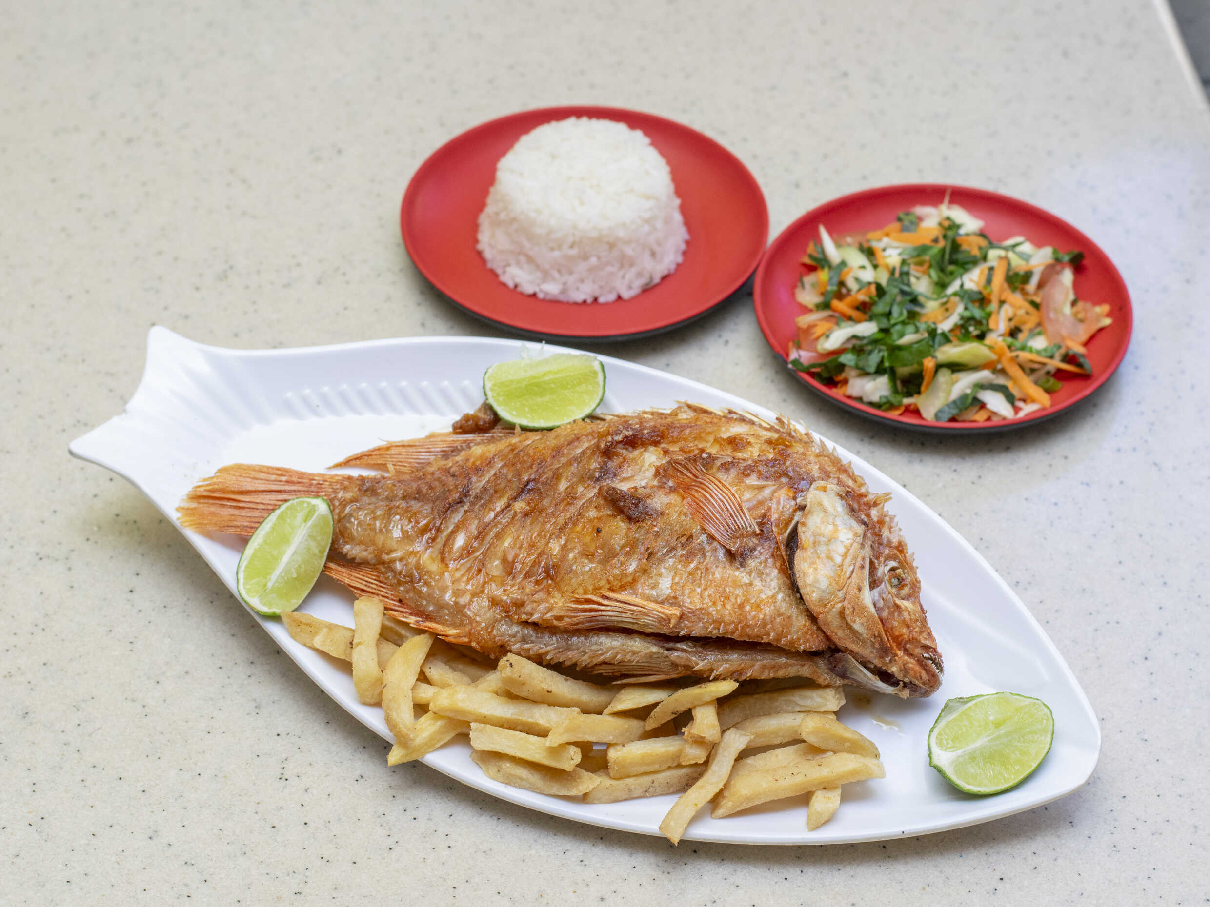 Mojarra frita, arroz, francesa y ensalada + gaseosa 250 ml.