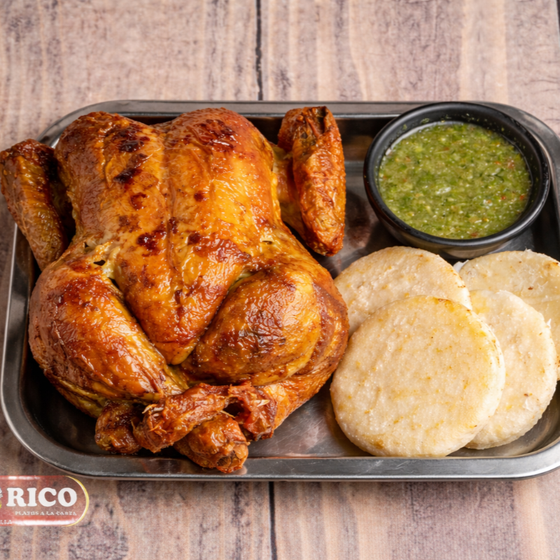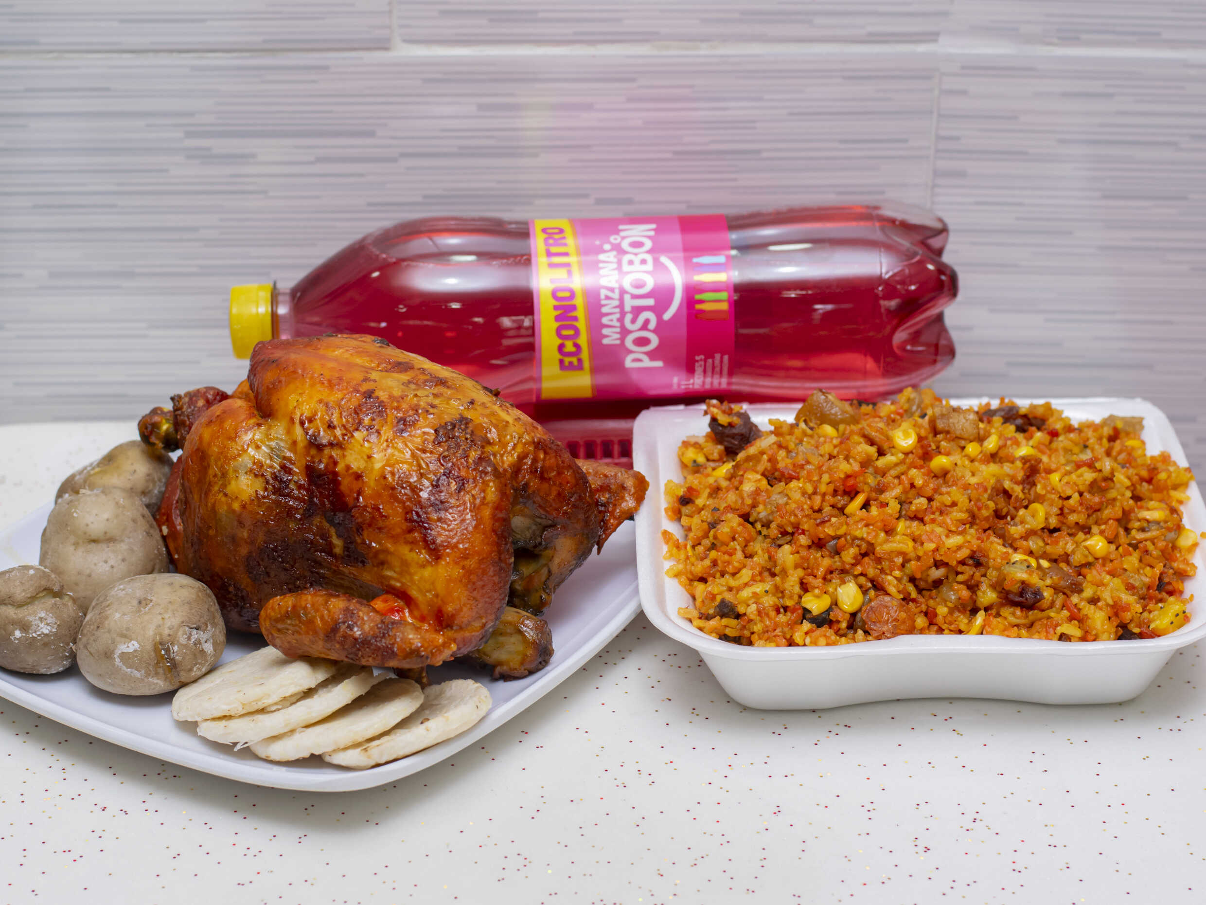 1 Pollo asado, papas saladas, arepa, 2 sopas del día, 2 porciones de arroz, 1 gaseosa Postobón 1 L (sabor sujeto a disponibilidad de la tienda).