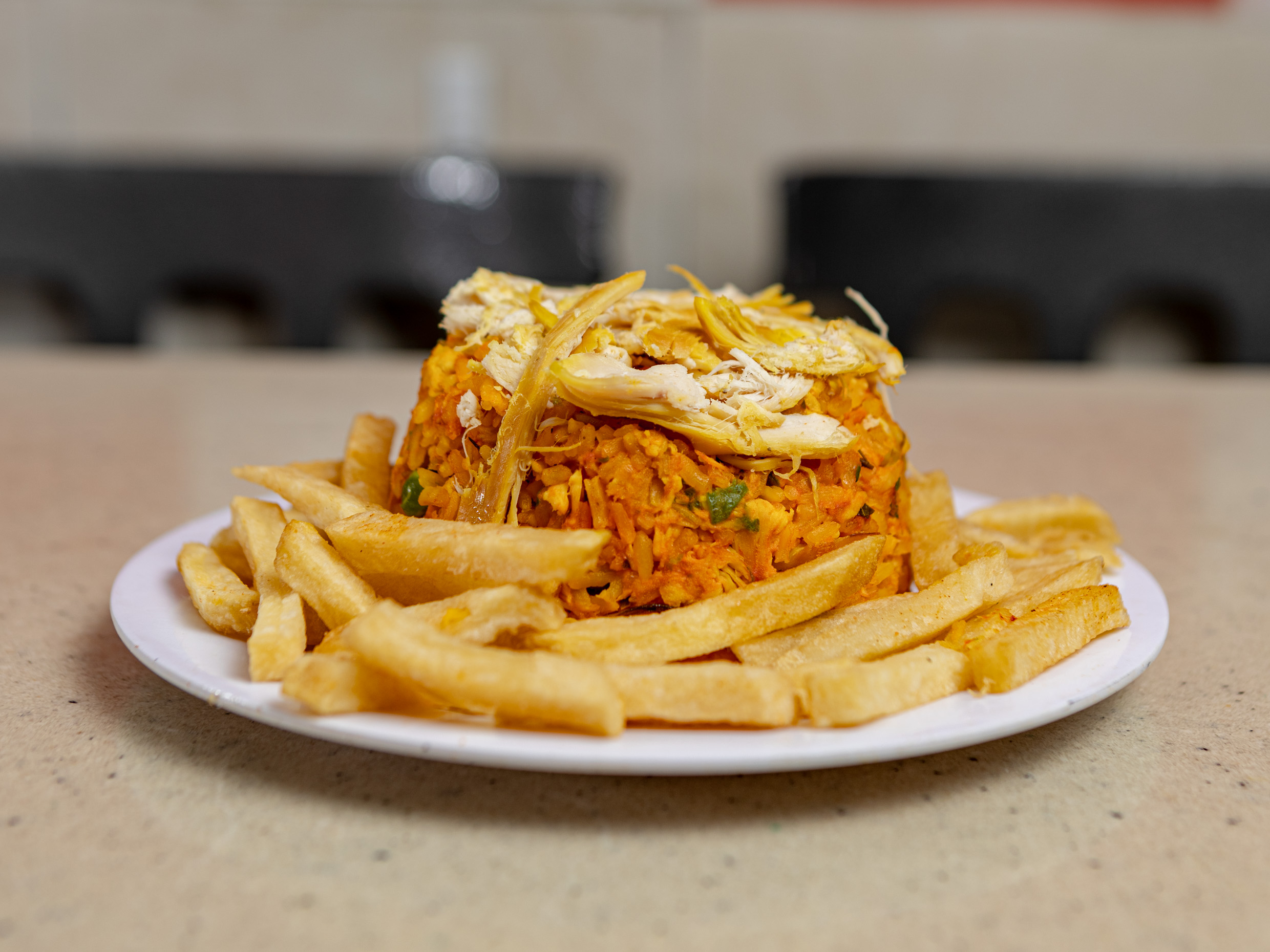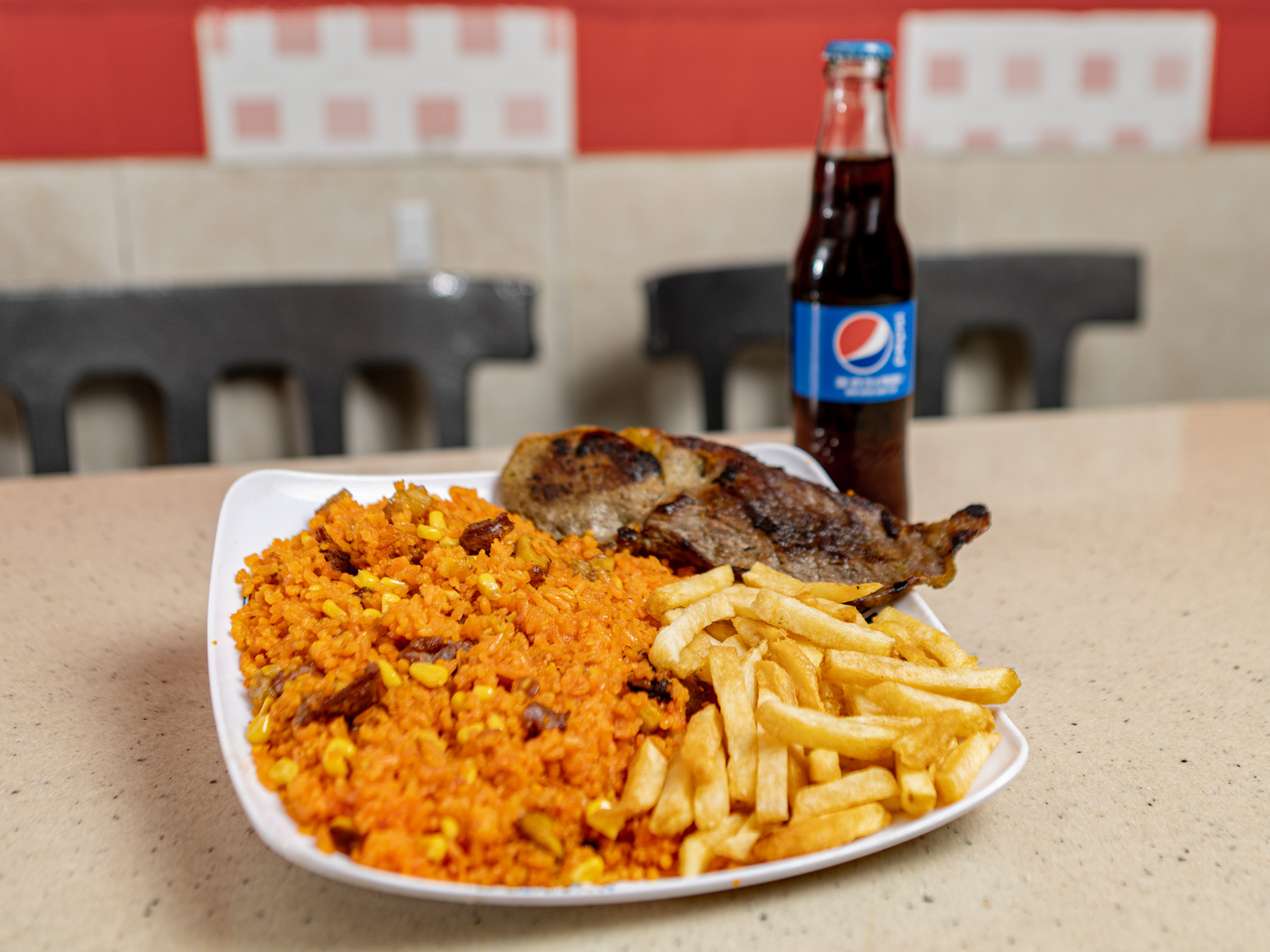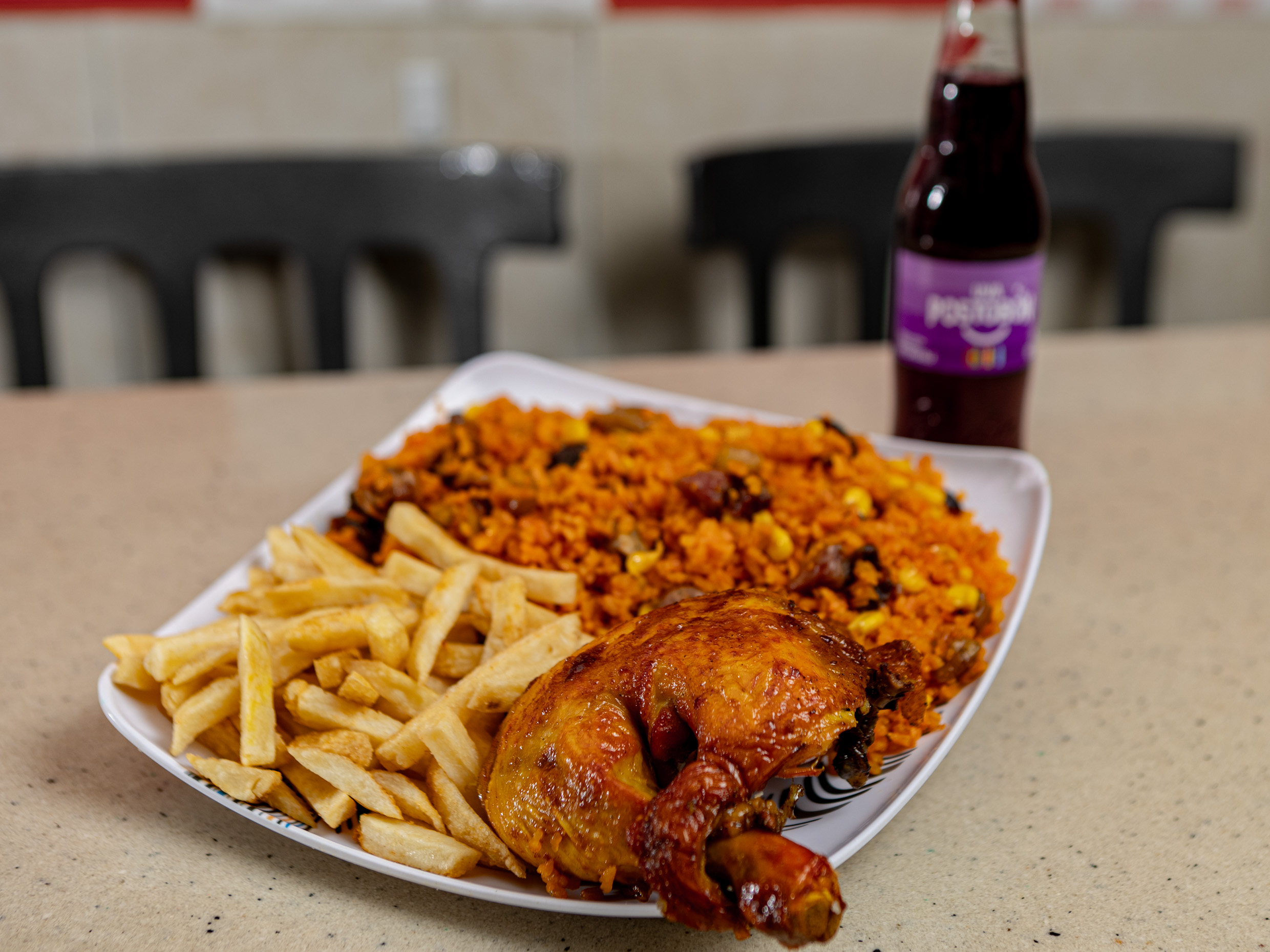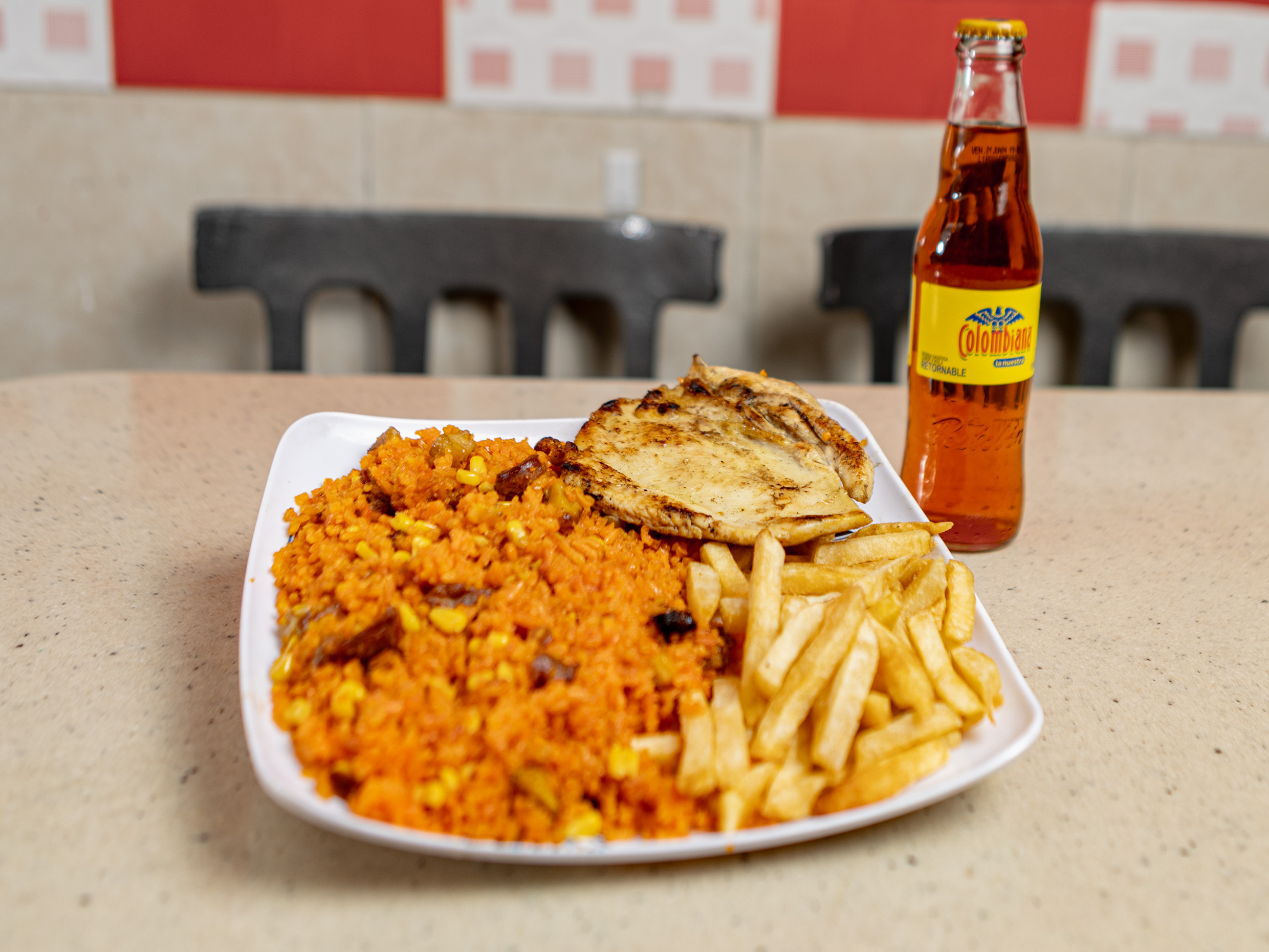 Arroz paisa con 1 cuarto de pollo a elección y papa francesa + gaseosa 250 ml postobón (sabor sujeto a disponibilidad de la tienda).