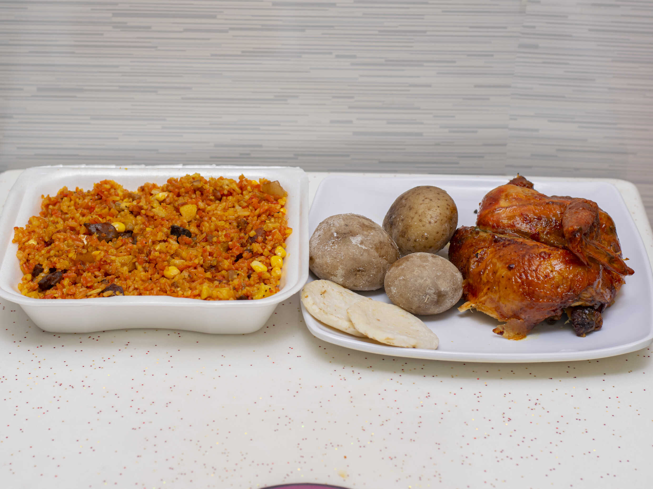 Arroz paisa, 4 presas de pollo asado, arepa y papa salada.