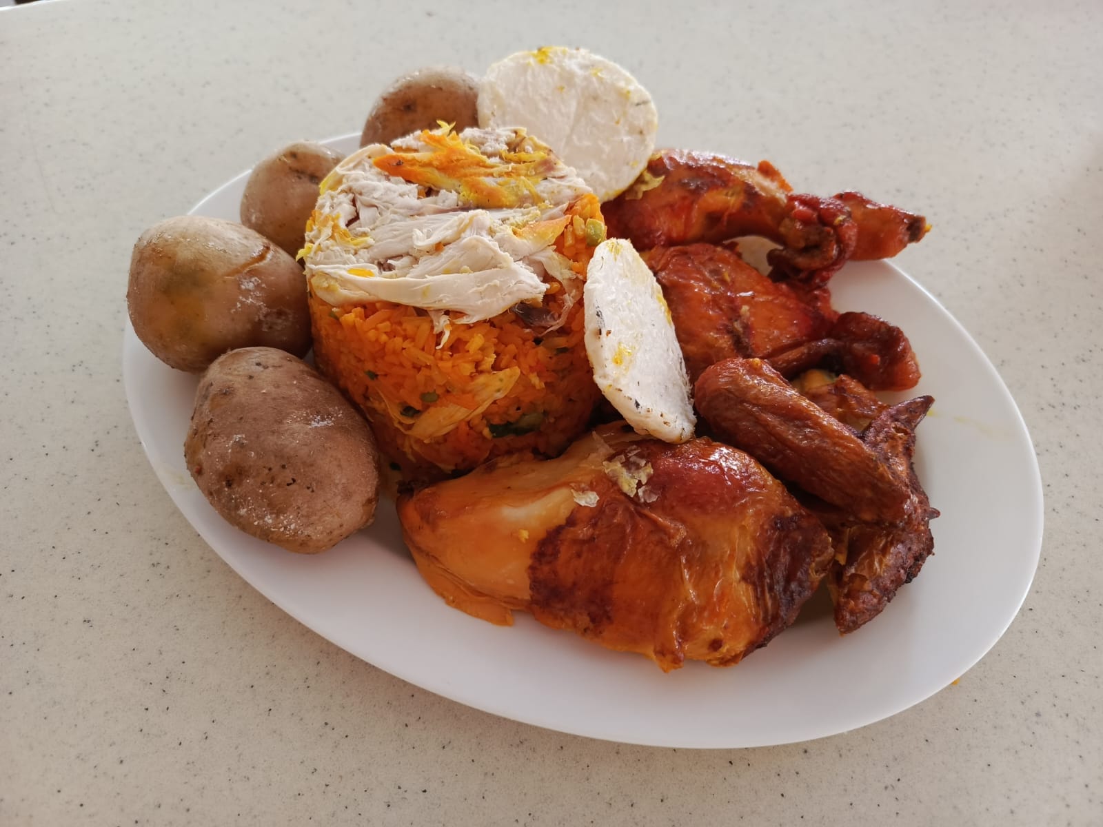 1/2 pollo asado, papa salada, arepa y arroz con pollo.