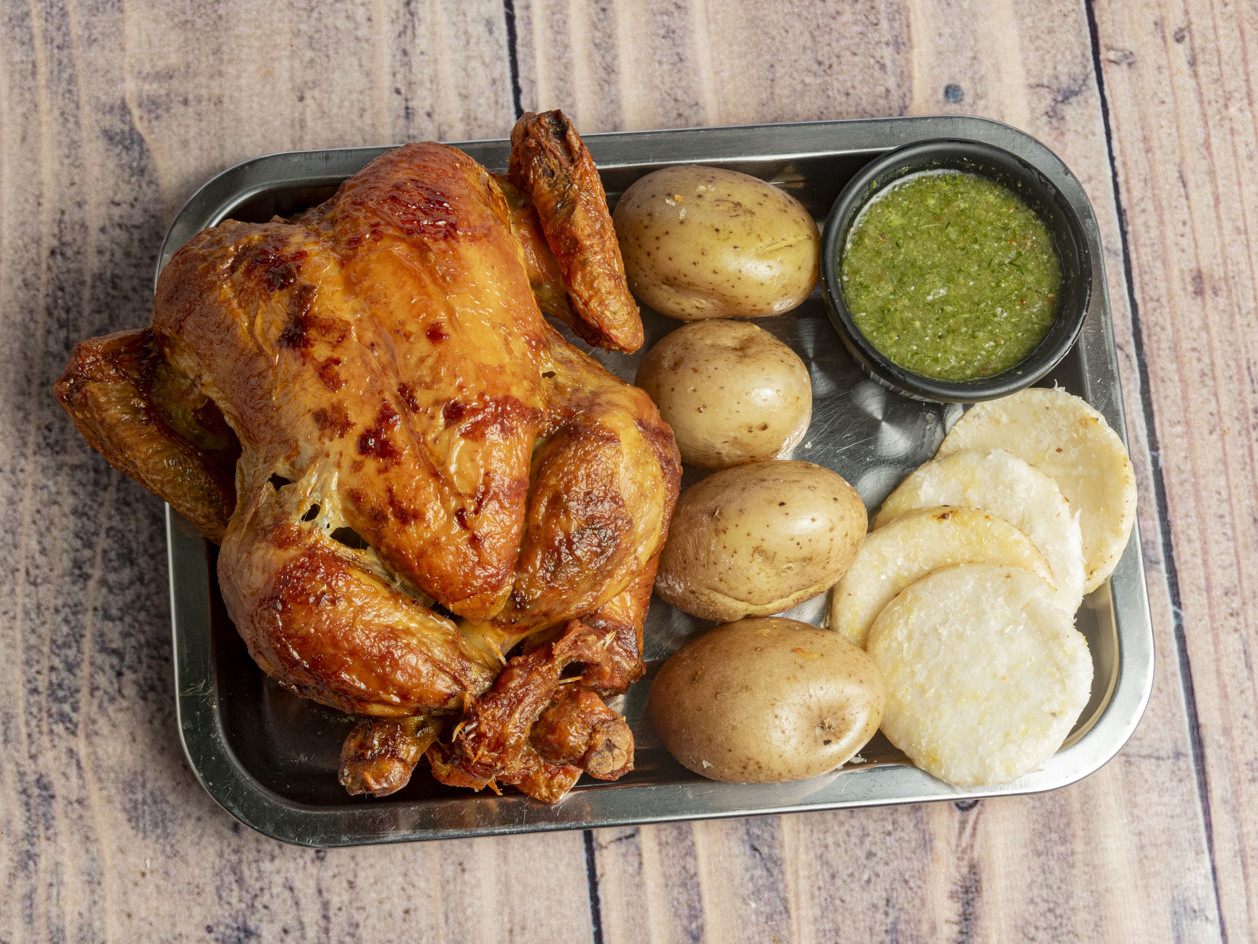 1 pollo asado, Carne de res, Carne de cerdo, Chorizo, Pechuga, Papa salada, Papa francesa, Yuca, Patacón