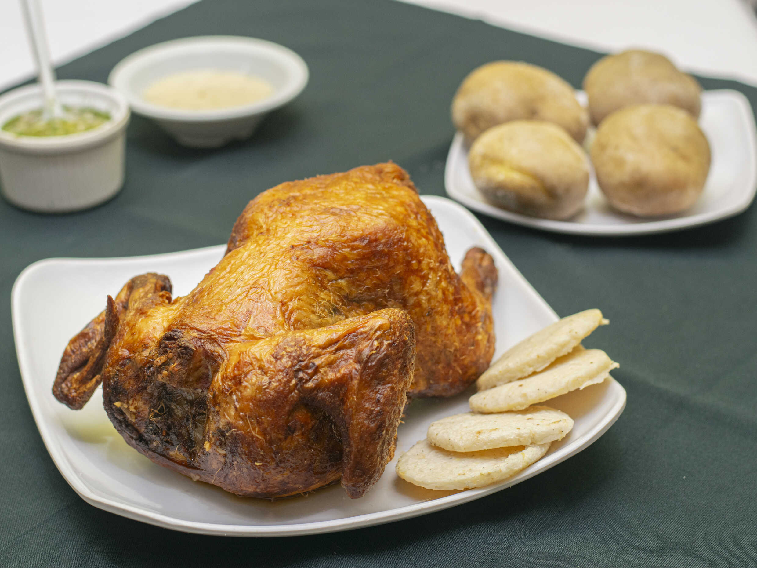 12 Presas de pollo con 9 papas saladas, 1 plátano de queso, bocadillo, salsas de la casa, ají, 8 arepas y bebida a elegir, 1.5 l.