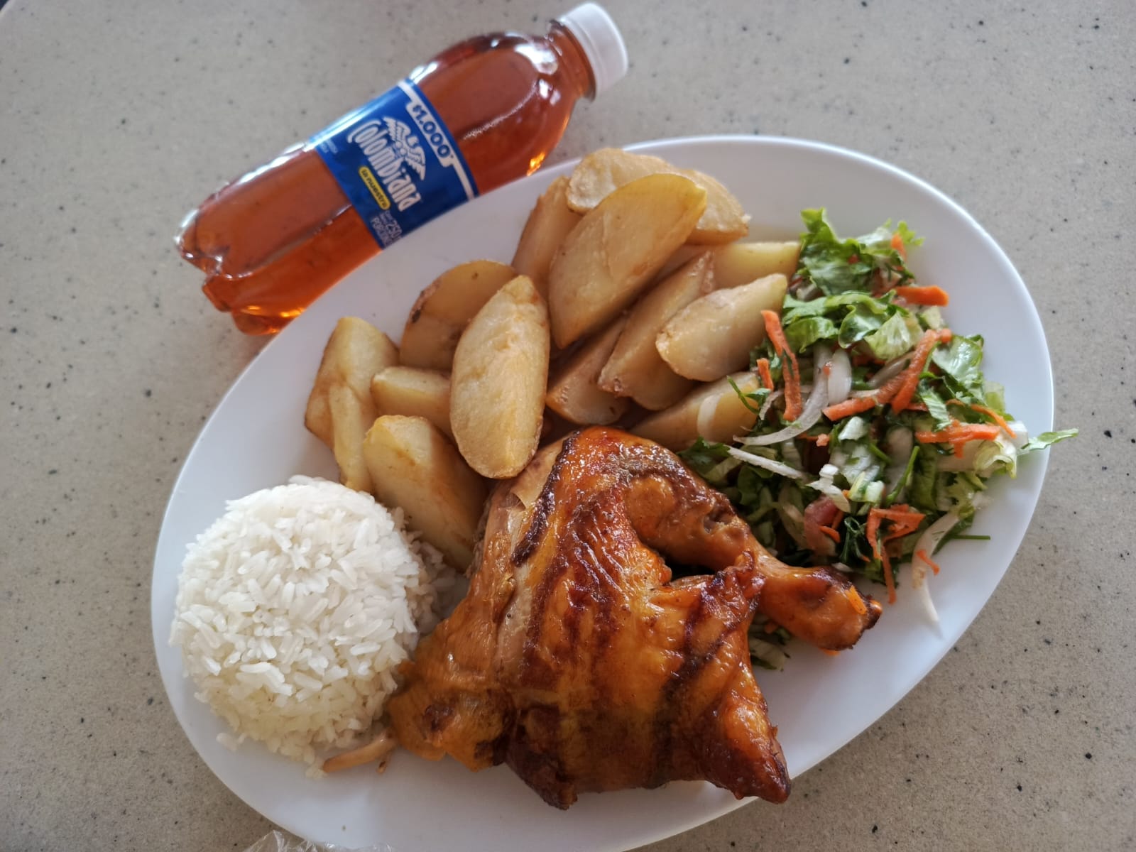 1/4 de pollo a elegir, papa artesanal, arroz, ensalada y gaseosa 250 ml postobón (sabor sujeto a disponibilidad de la tienda).