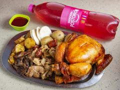 1/2 Pollo Asado, carne de res, chorizo, lomo de cerdo, pechuga a la plancha, papa salada, plátano y arepa + gaseosa 1 L (sabor sujeto a disponibilidad de la tienda).