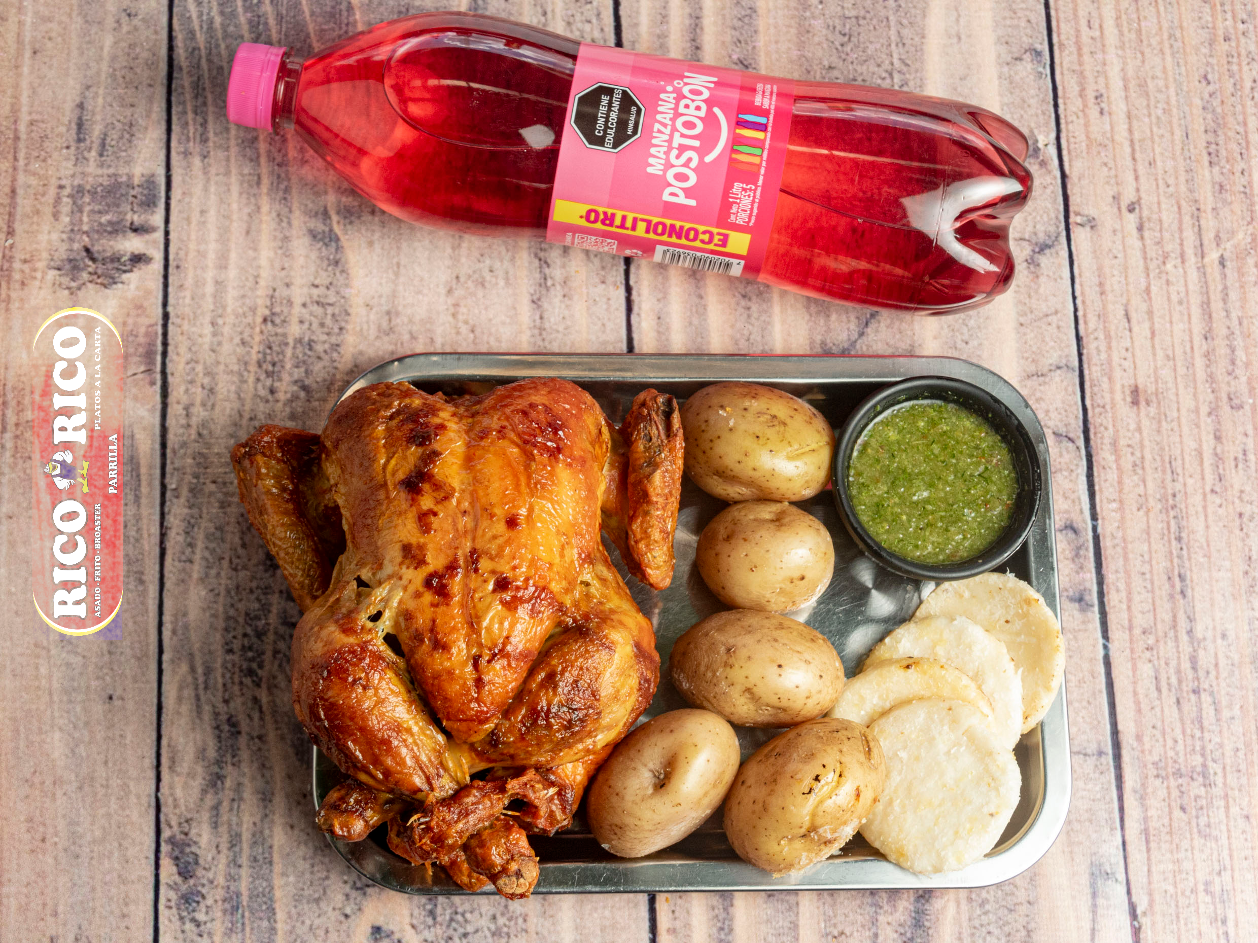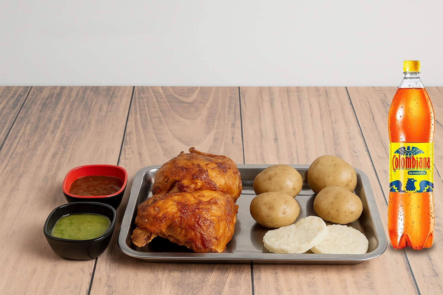 1 Pollo asado, papas saladas, arepa, 2 sopas del día, 2 porciones de arroz, 1 gaseosa Postobón 1 L (sabor sujeto a disponibilidad de la tienda).