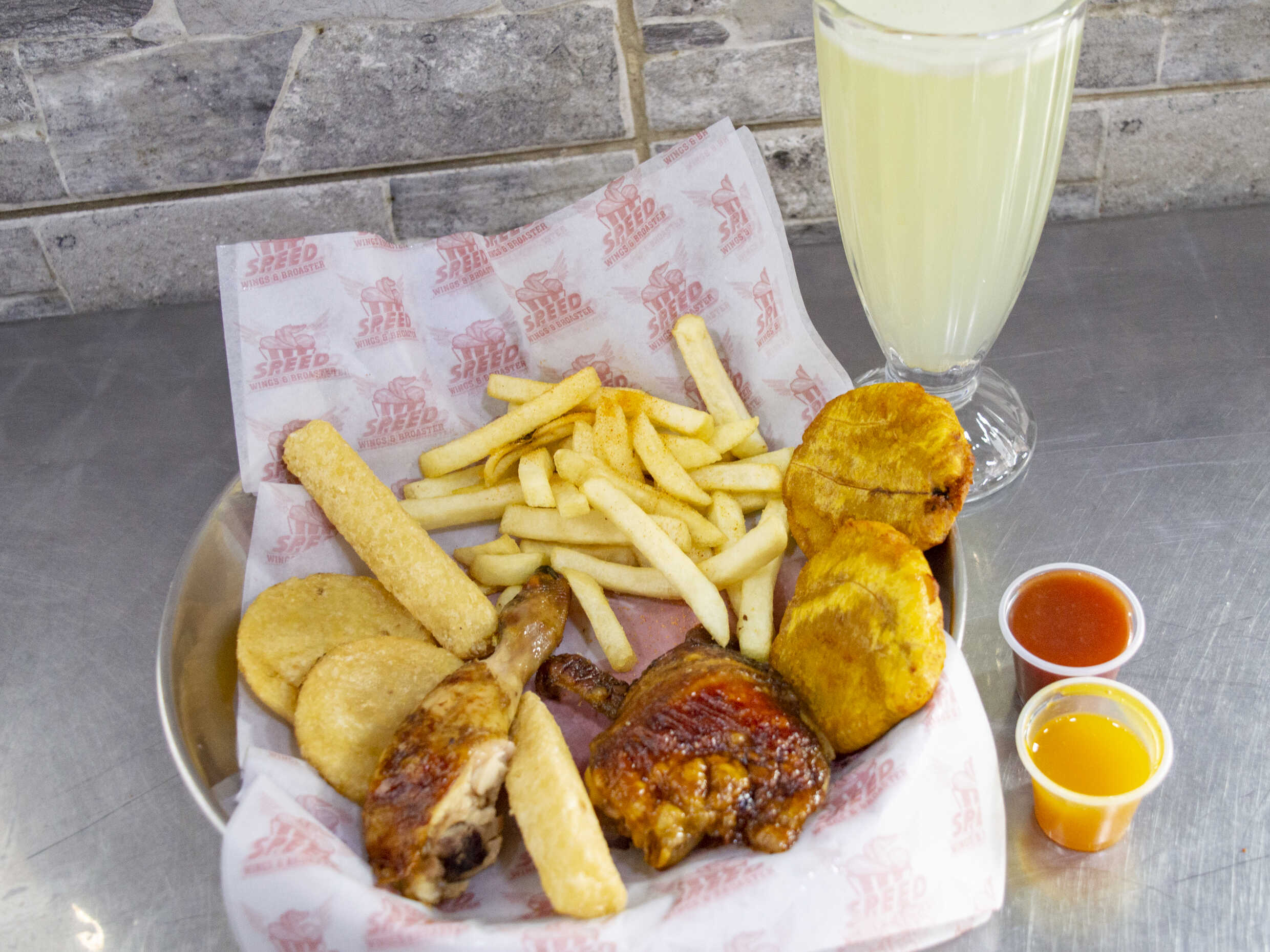 Arroz con Pollo Deli acompañado de 10 piezas de alitas BBQ, papas francesas+ limonada natural