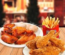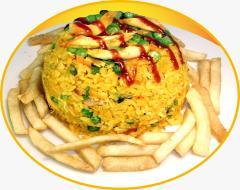 Arroz con pollo acompañado de papas a francesa, 10 piezas de alitas BBQ, arepa frita y Obsequio limonada.