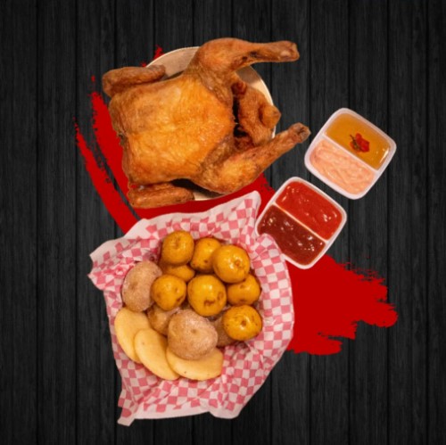 4 presas de pollo asado acompañadas de papas saladas (1 porción) más arepas ( 2 unidades), salsa de tomate
