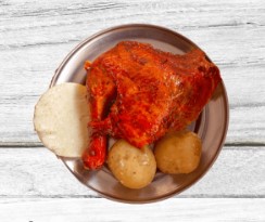 Medio pollo broaster acompañado de arepa y yucas