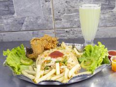 2 Presas, papa salada o francesa, yuca, patacón, arepa, arroz y limonada.