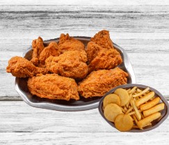 8 Deliciosas presas de pollo asado, acompañada de 5 arepas fritas.