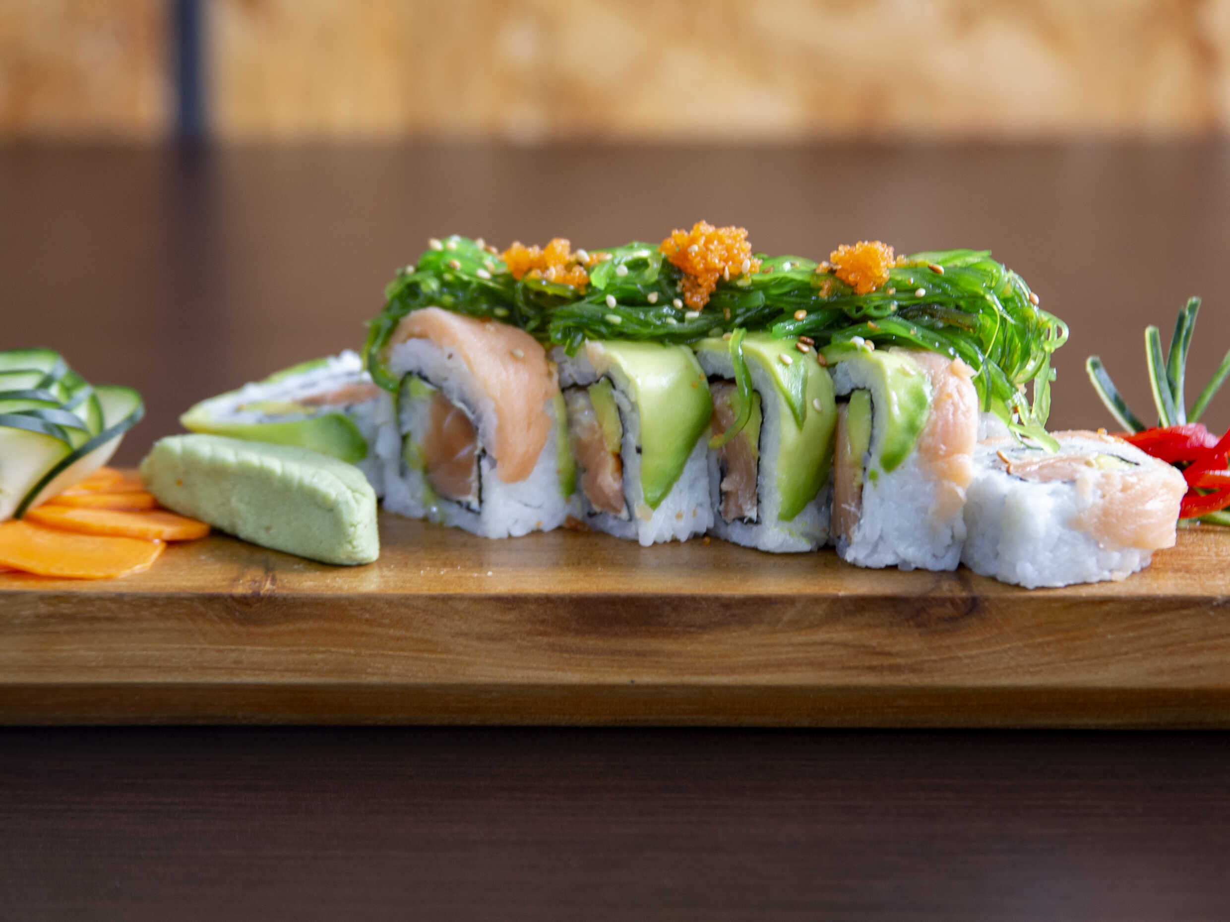 Salmón, aguacate, queso crema y por la parte superior cortes de salmón, aguacate, wakame y masago.
