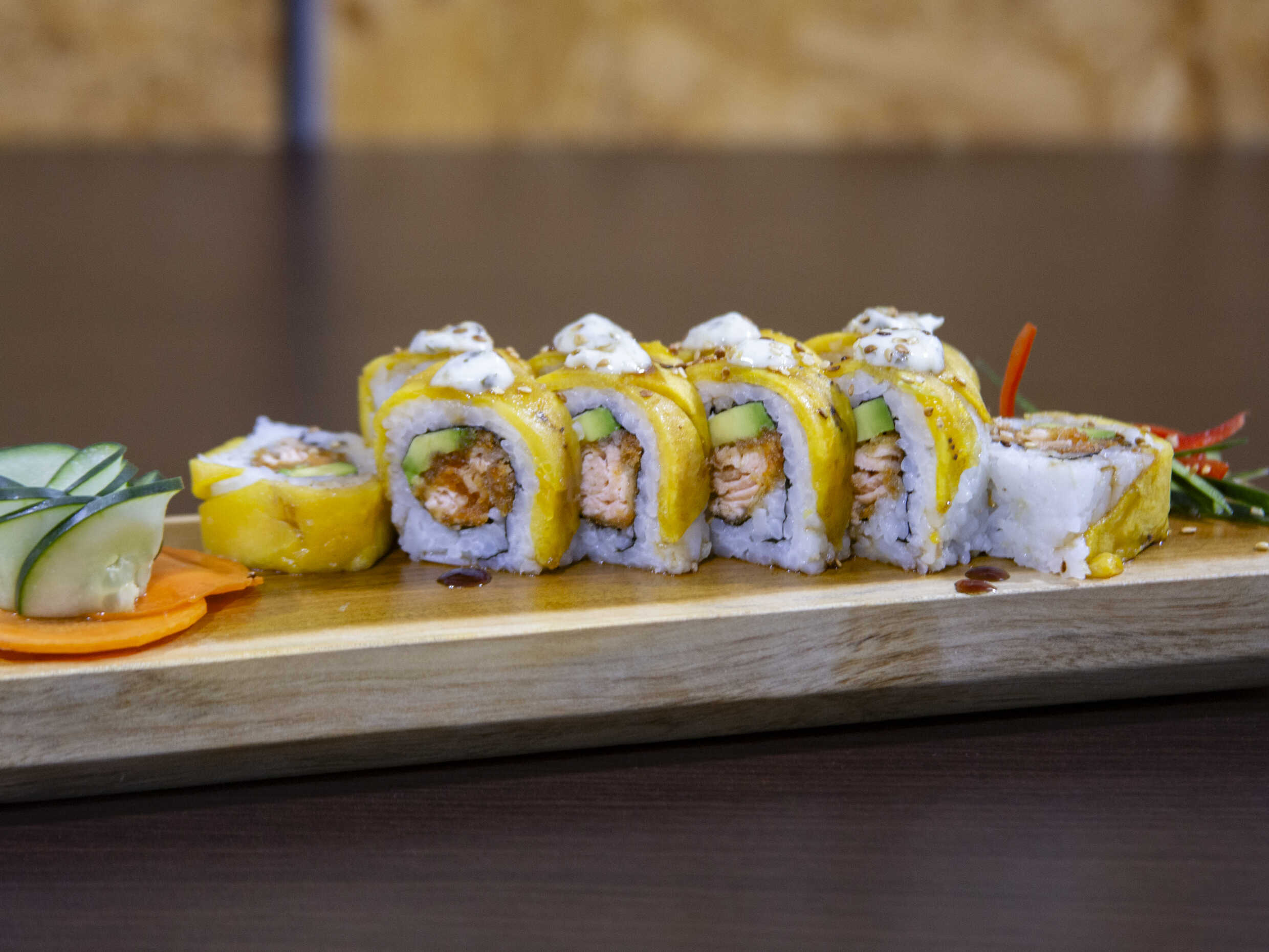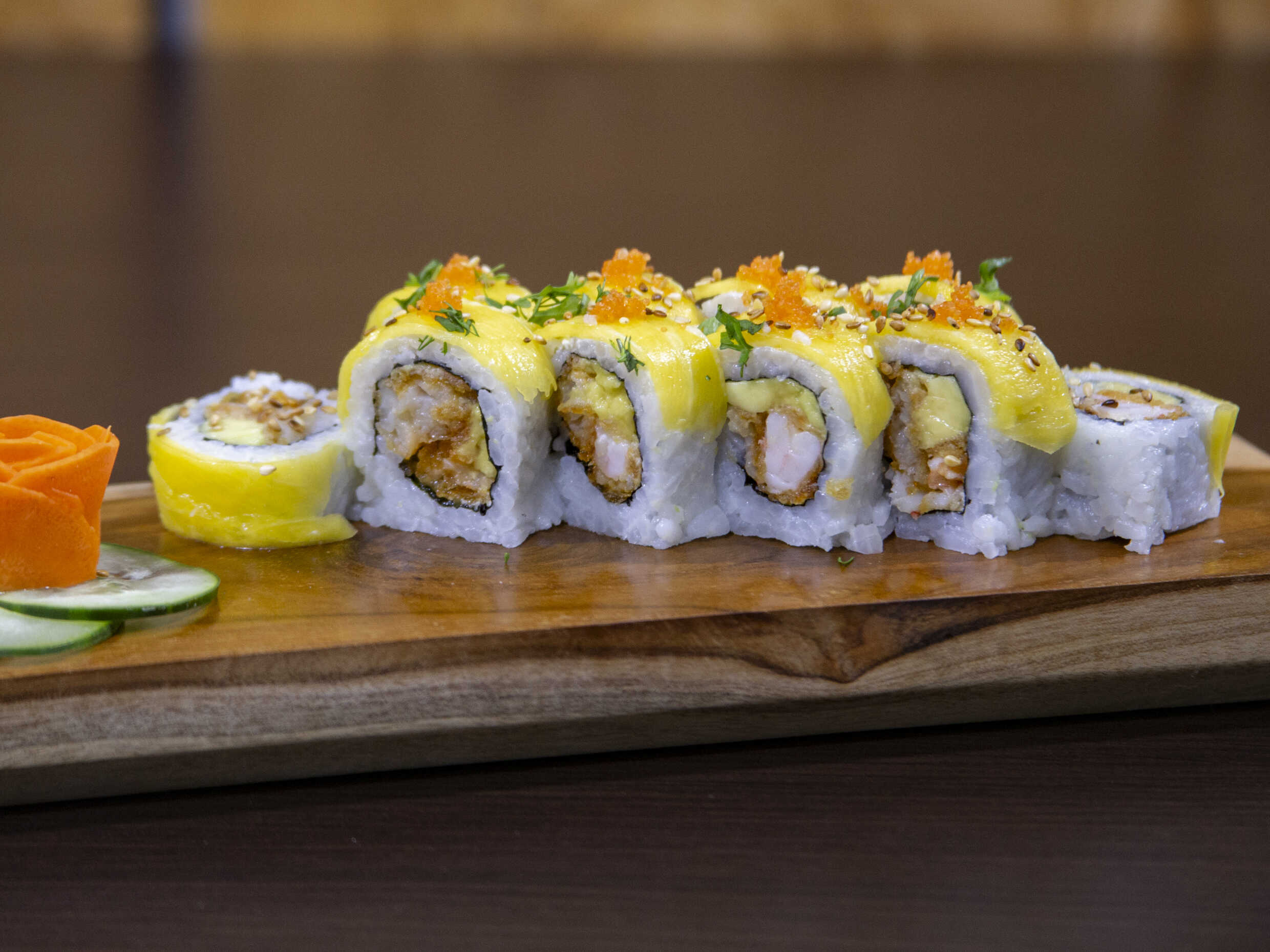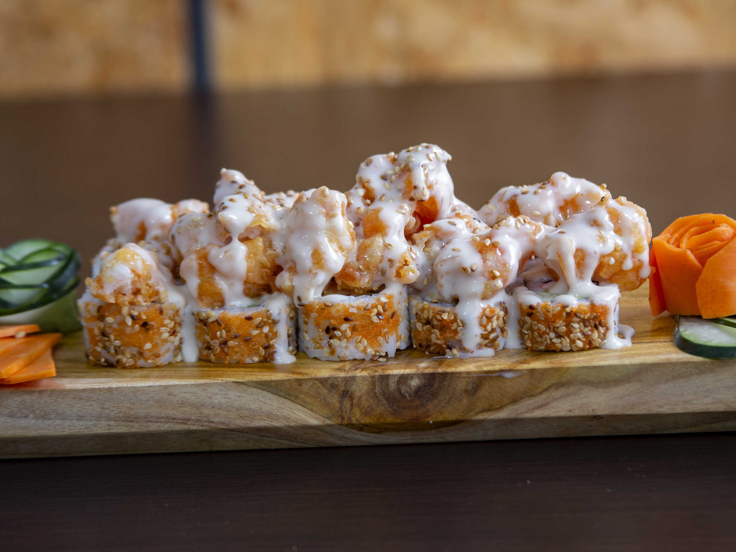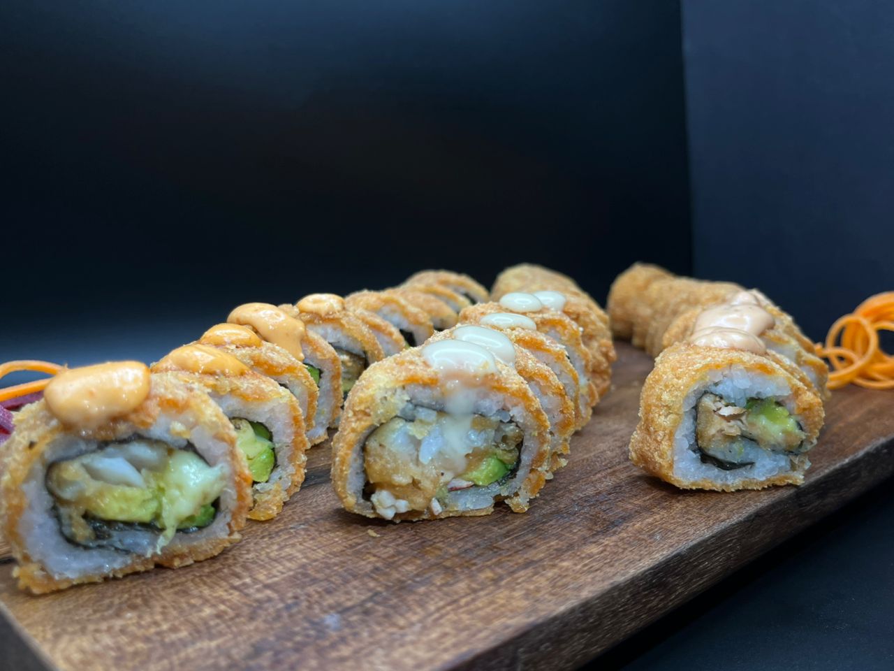 Roll tempurizado y apanado relleno de queso crema, cebollín, pescado tempurizado, salmón ahumado, aguacate, cangrejo, masago con tope de salmón, mezcla de camarones tempurizados, cangrejo, masago, cebollín, mayonesa y salsa de la casa.