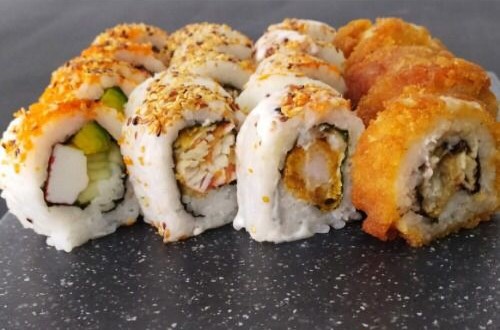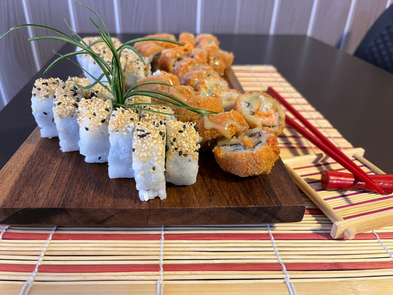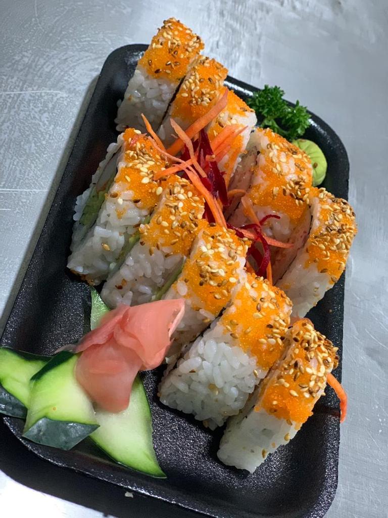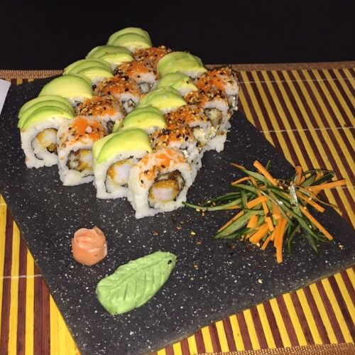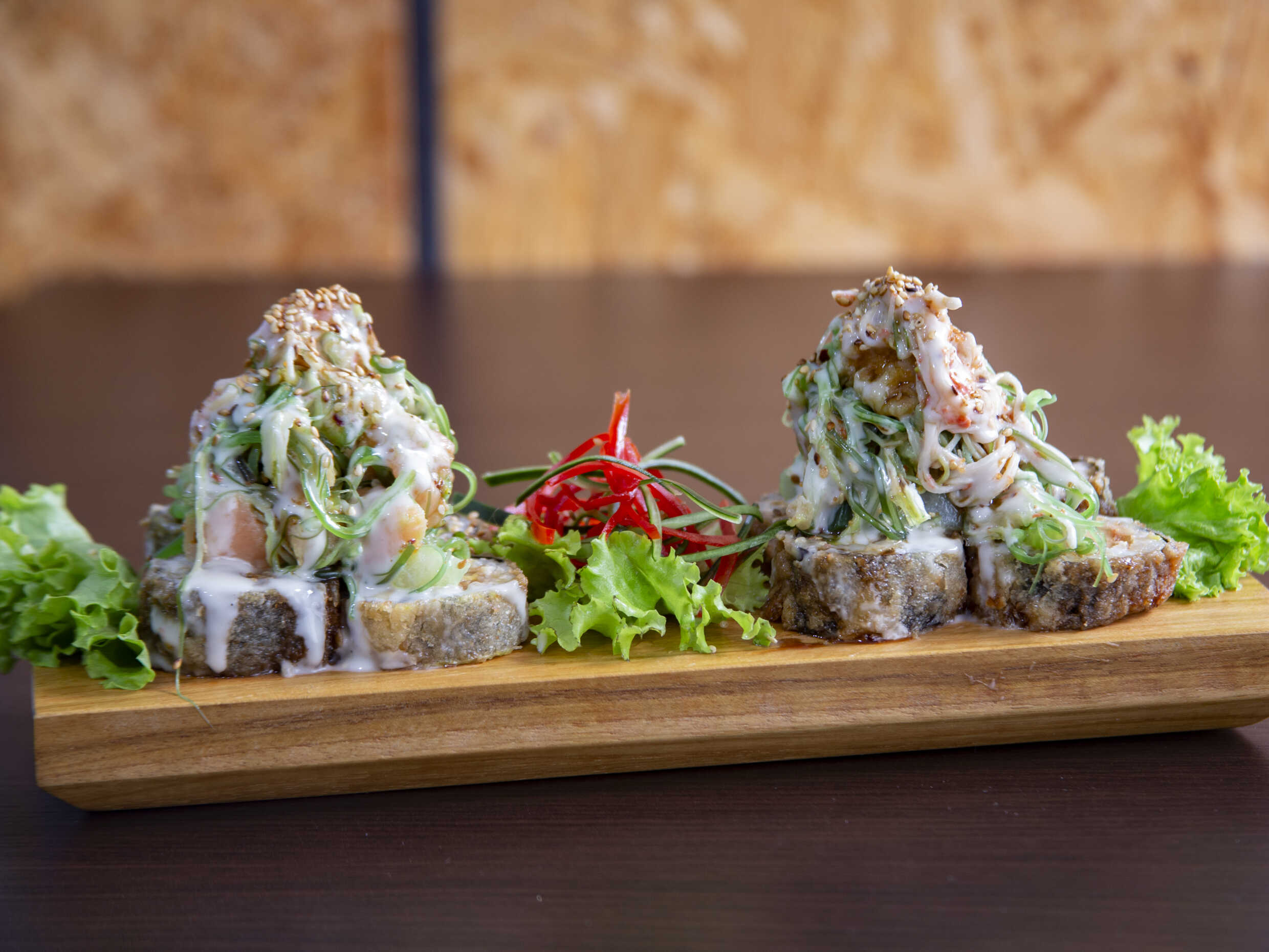 Roll tempurizado y apanado relleno de queso crema, cebollín, pescado tempurizado, salmón ahumado, aguacate, cangrejo, masago con tope de salmón, mezcla de camarones tempurizados, cangrejo, masago, cebollín, mayonesa y salsa de la casa.
