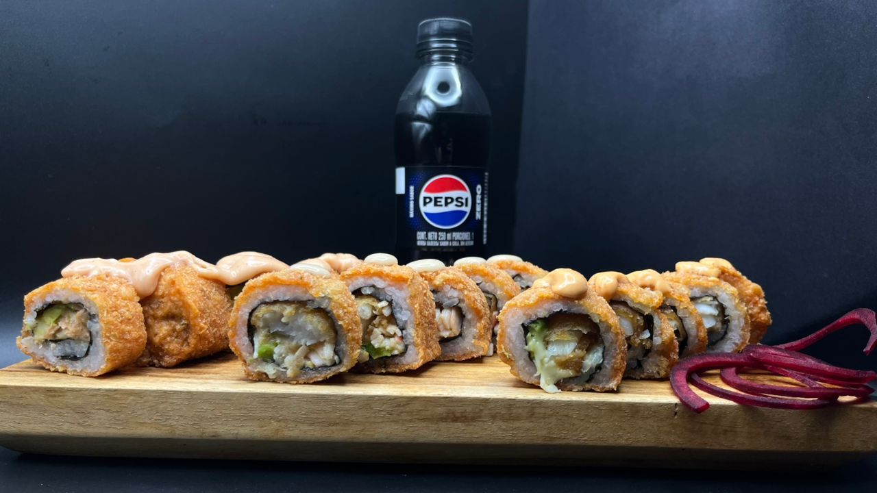 10 California roll, 10 dinamita roll, 10 salmón skin, 10 fish roll más 1 gaseosa Pepsi cola de 1.5 L. para 2 a 3 personas