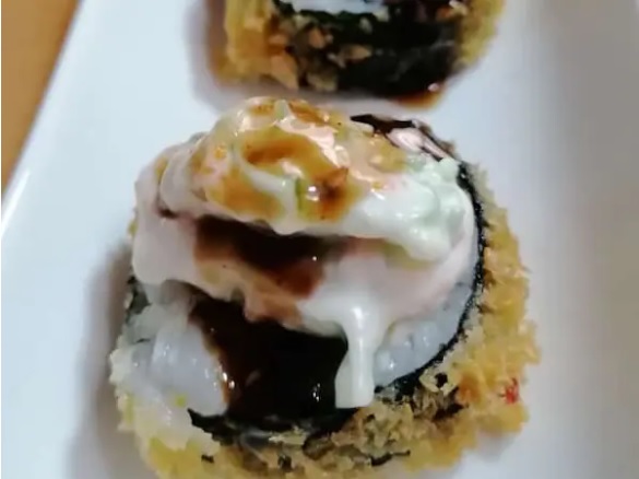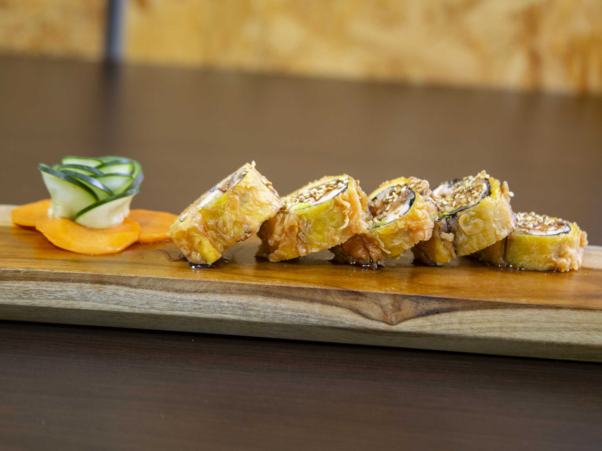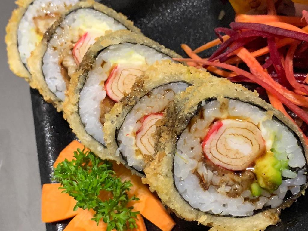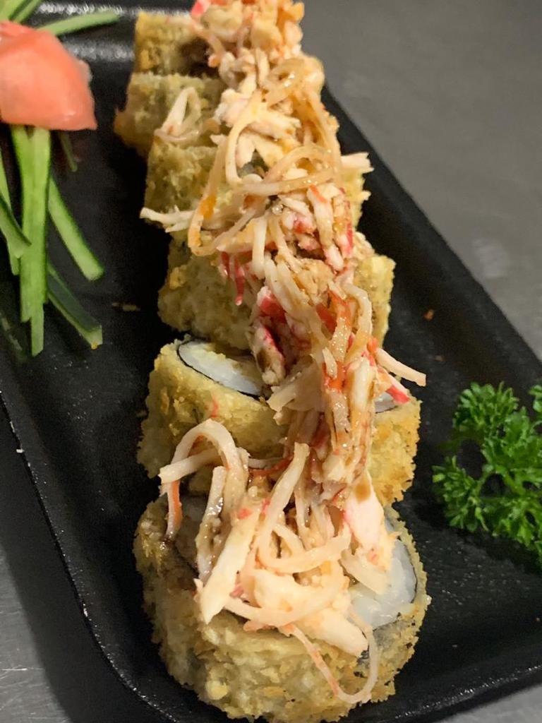 Cangrejo, kampachi, aguacate, queso crema, tempurizado y en panko, en salsa de la casa.