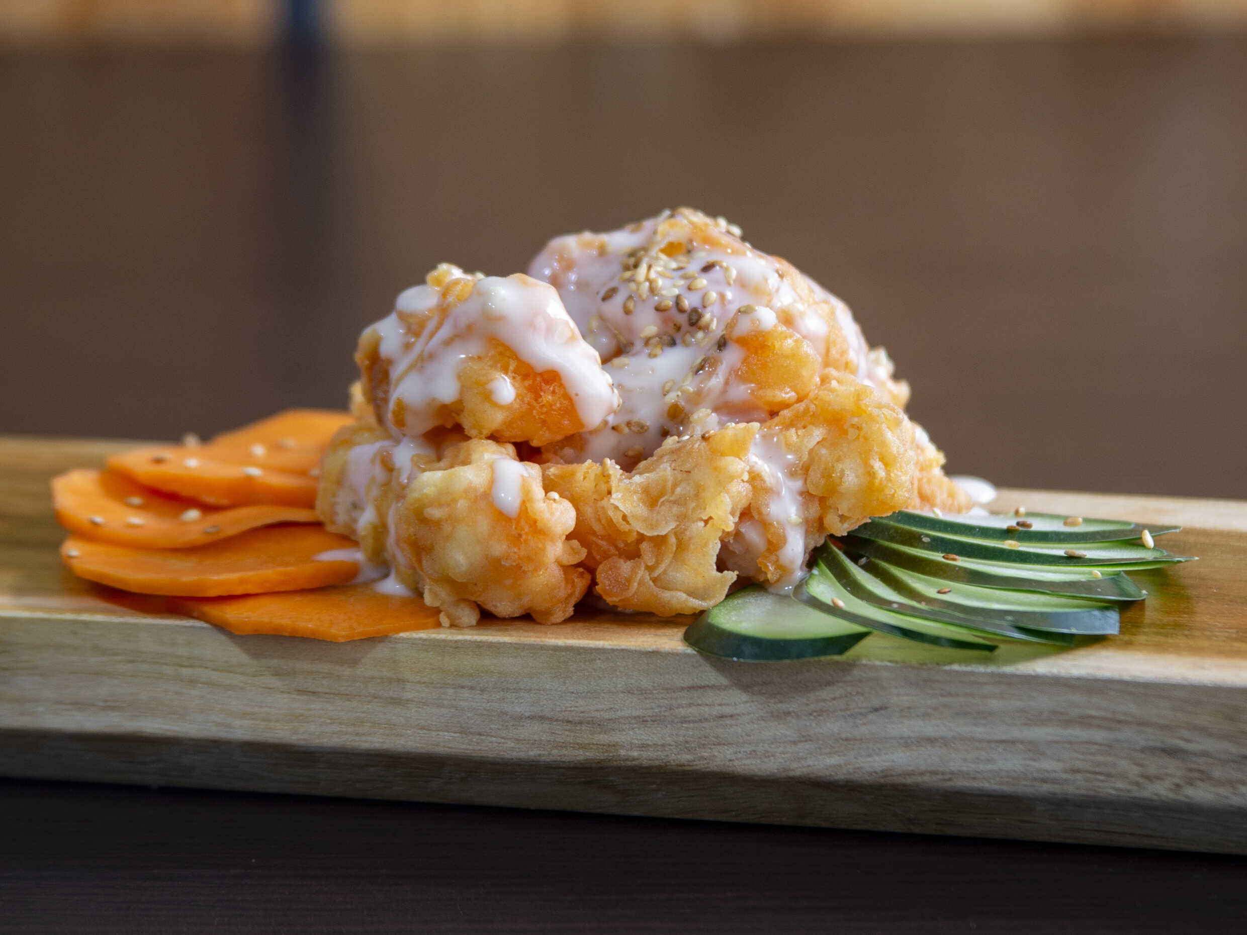 Langostinos tempurizados, cebollín, queso crema, masago, tope de crispí de langostino en salsa de la casa.