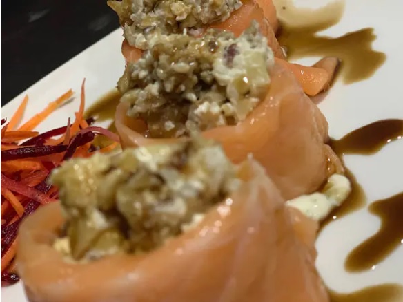 Bolitas de arroz, cebollín, masago picante y chispas de tempura, cubierta de salmón ahumado con una mezcla de pescado de la casa y nueces en base de salsa dinamita.